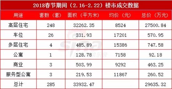 春节期间汕头楼市成交火热 在开发商的卖力吆喝和春节大批人群返乡的背景下,汕头楼市春节期间成绩不俗。据联广数据统计,春节放假期间(2月16日-2月22日),汕头楼市共成交285套,成交面积共33932.47㎡,其中,高层住宅成交248套,成交均价8524元/㎡;多层住宅成交4套,成交均价15386元/㎡,其他情况详见表格。