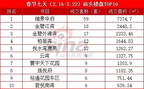 潮阳、濠江、龙湖成交占比大 数据显示,春节7天汕头新房备案区域排名分别为潮阳区、濠江区、龙湖区、澄海区、南澳区、金平区。