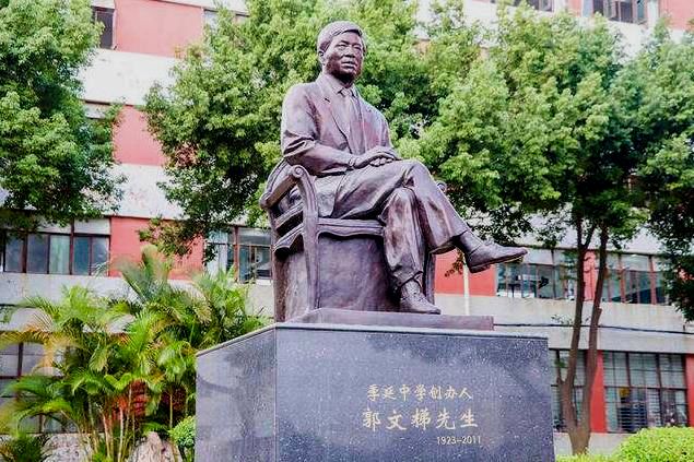 季延中学创办人郭文梯先生塑像 “若有一个人,家乡罹难,亲友失散,而未轻言放弃,此人可谓不容易。若此人决意脱开苦海,远离家乡,走向待为开垦的荒田,此人可谓有勇气。若此人在异域奋力拼搏,打出一条道路,此人可谓是人杰。若此人能领超众人,直附青云,得陶朱之家业,此人可谓是豪杰。若此人功成名就,仍未忘其本,心系故国,此人可谓是君子。若此人还能目在千秋,投其身于教育,寄其冀于青年,此人可谓是大贤。”