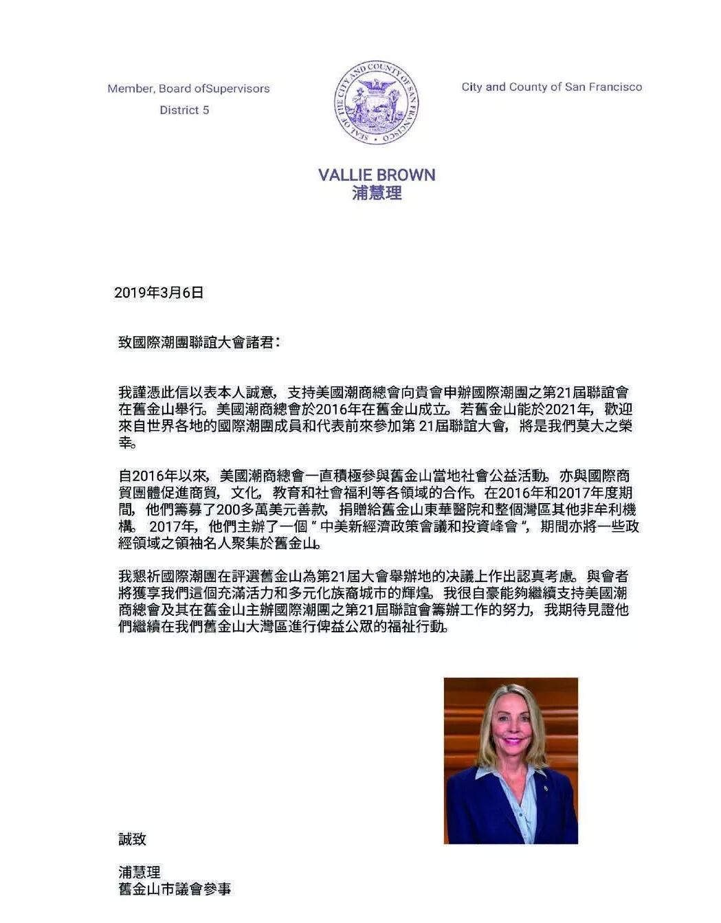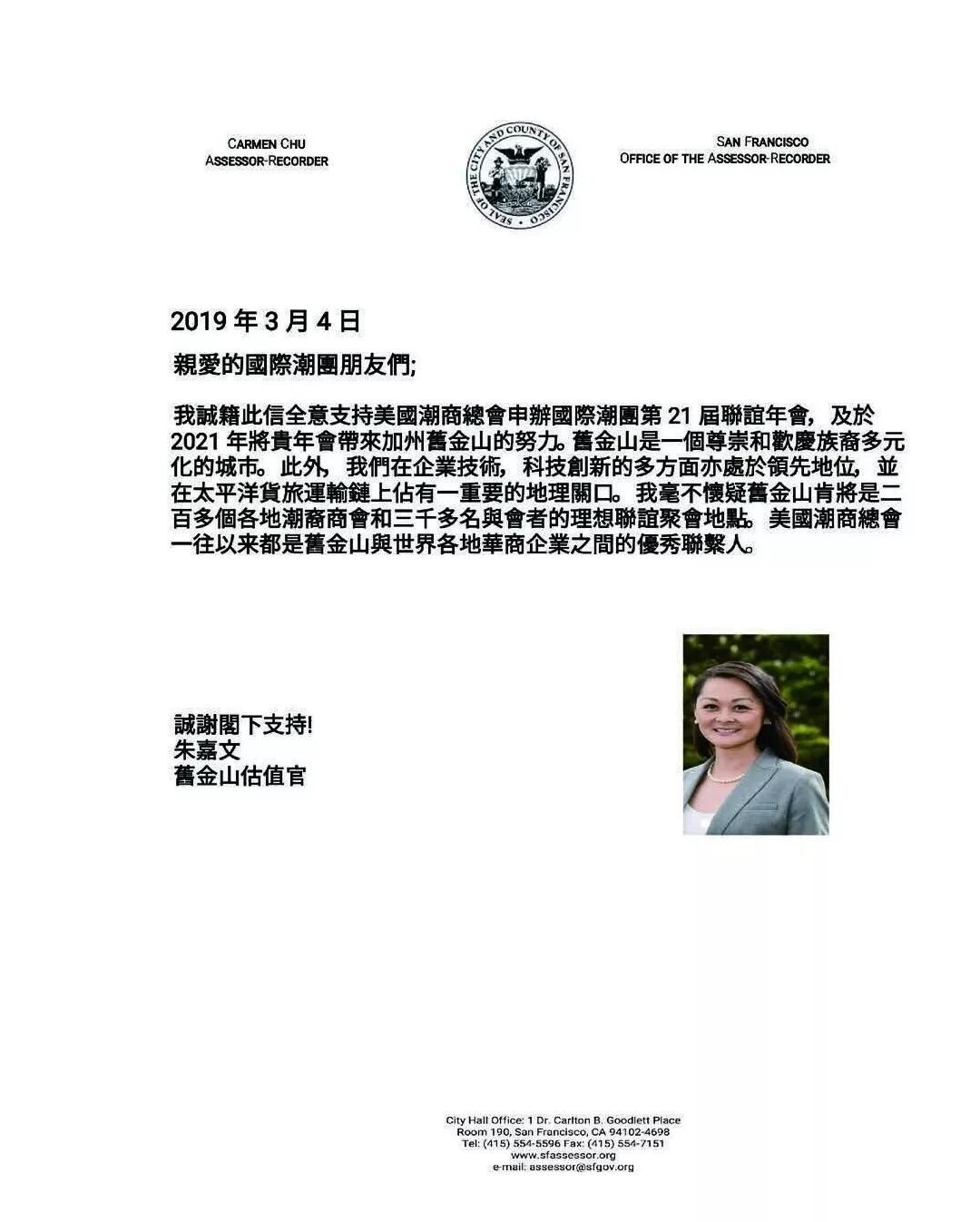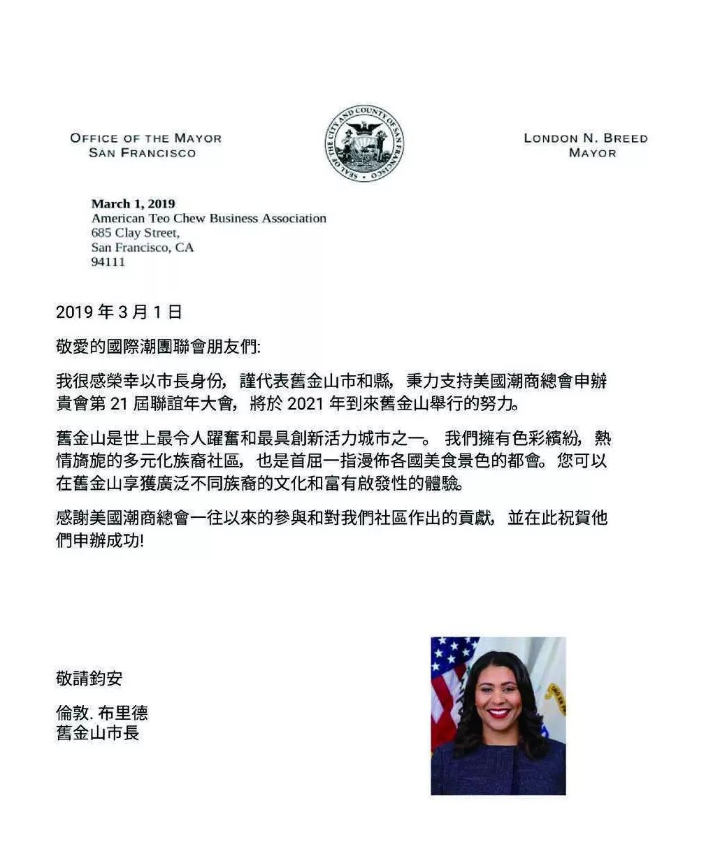 在本次代表团出发前,美国潮商总会特别录制了申办视频,其中旧金山市长伦敦•布里德、加州众议员邱信福、加州参议员威善高均在视频中为美国潮商总会背书,并热烈欢迎并期望第二十一届国际潮团总会年会在美丽的旧金山举行。同时美国潮商总会还制作印刷了精美的“申办书”,详细介绍了美国潮商总会、包括加州州长纽森(Gavin Newsom)在内的多位美国政府官员致辞信,并介绍了旧金山湾区的现状,以及在旧金山举办的意义和呈报了这些年美国潮商总会所发展的里程碑事件。 让我们预祝美国潮商总会代表团一行此行顺利,并热烈期待美国潮商总会获得“国际潮团总会第21届国际潮团联谊年会”申办权,美丽的旧金山在期待着!