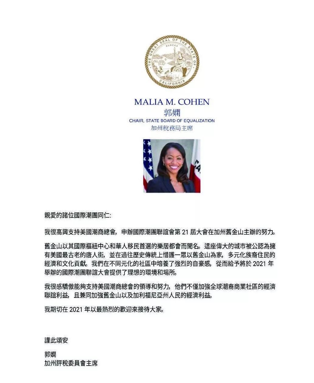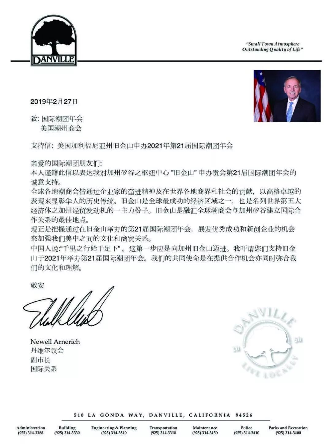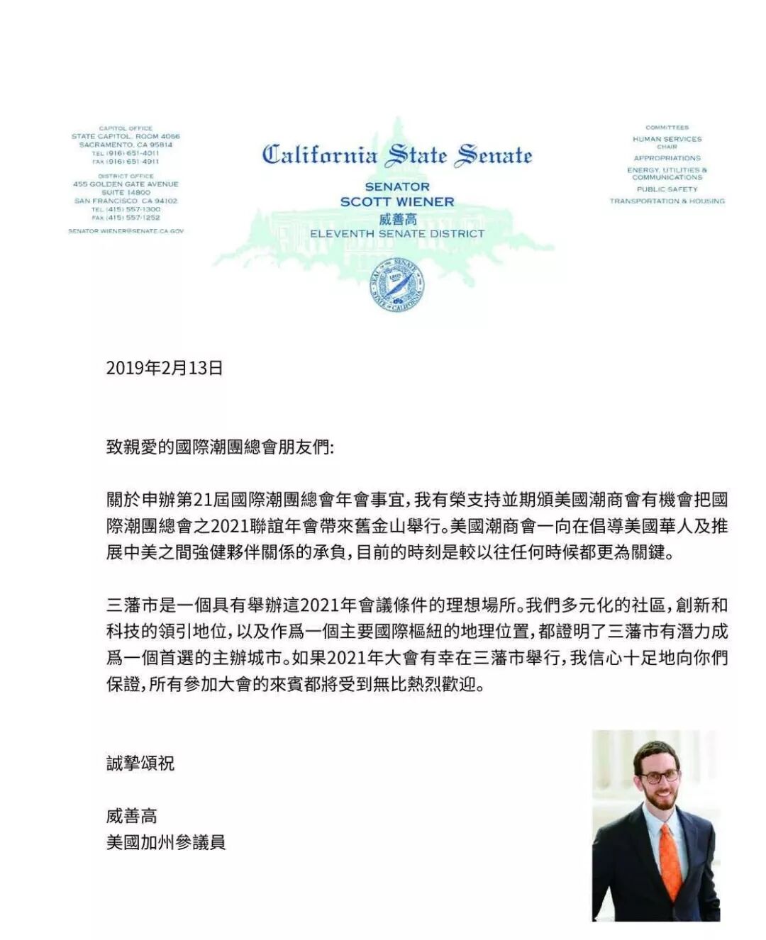 在本次代表团出发前,美国潮商总会特别录制了申办视频,其中旧金山市长伦敦•布里德、加州众议员邱信福、加州参议员威善高均在视频中为美国潮商总会背书,并热烈欢迎并期望第二十一届国际潮团总会年会在美丽的旧金山举行。同时美国潮商总会还制作印刷了精美的“申办书”,详细介绍了美国潮商总会、包括加州州长纽森(Gavin Newsom)在内的多位美国政府官员致辞信,并介绍了旧金山湾区的现状,以及在旧金山举办的意义和呈报了这些年美国潮商总会所发展的里程碑事件。 让我们预祝美国潮商总会代表团一行此行顺利,并热烈期待美国潮商总会获得“国际潮团总会第21届国际潮团联谊年会”申办权,美丽的旧金山在期待着!
