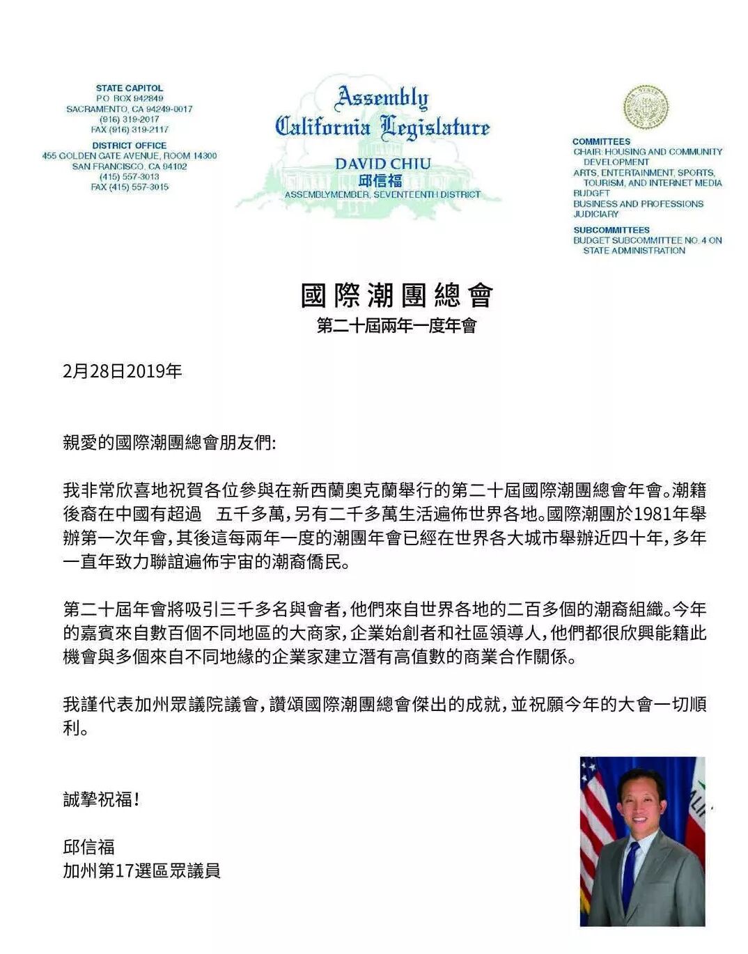 点击以下视频 观看完整版申办宣传片 【硅谷时报讯】美国时间2019年3月14日,美国潮商总会代表团一行乘坐班机前往美丽的千帆之都--新西兰奥克兰市,参加国际潮团总会第二十届年会。在本届年会上,将投票决定2021年年会的举办地最终花落谁家。国际潮团联谊年会是国际潮团总会最主要的活动之一,自1981年起每两年一次于世界各地举行,首届年会于1981年由香港潮州总会主办,目前,美国潮商总会正在积极申办第二十一届年会。加州州长、旧金山市长、加州参众两院议员等,特别在旧金山湾区成功的政界,商界众多人士,其中还有北美80多位大学教授、院长、博士、科学研究员等为支持美国潮商总会申办2021年第二十一届国际潮团总会年会的主办权纷纷助力。 旧金山市长布里德表示,旧金山是美国加利福尼亚州太平洋沿岸的港口城市,是世界著名旅游胜地、加州人口第四大城市,它临近世界著名高新技术产业区硅谷,是世界最重要的高新技术研发基地和美国西部最重要的金融中心。 这里也有很多华人,他们团结务实,积极努力,特别是像美国潮商总会每年向侨立东华医院捐助巨额善款,在社区活动中有林辉勇、林志斯先生这样的华人领袖带领下, 出钱出力, 对社区贡献良多。她表示,她大力支持美国潮商总会申办年会主办权,并且期待能在旧金山湾区举办。
