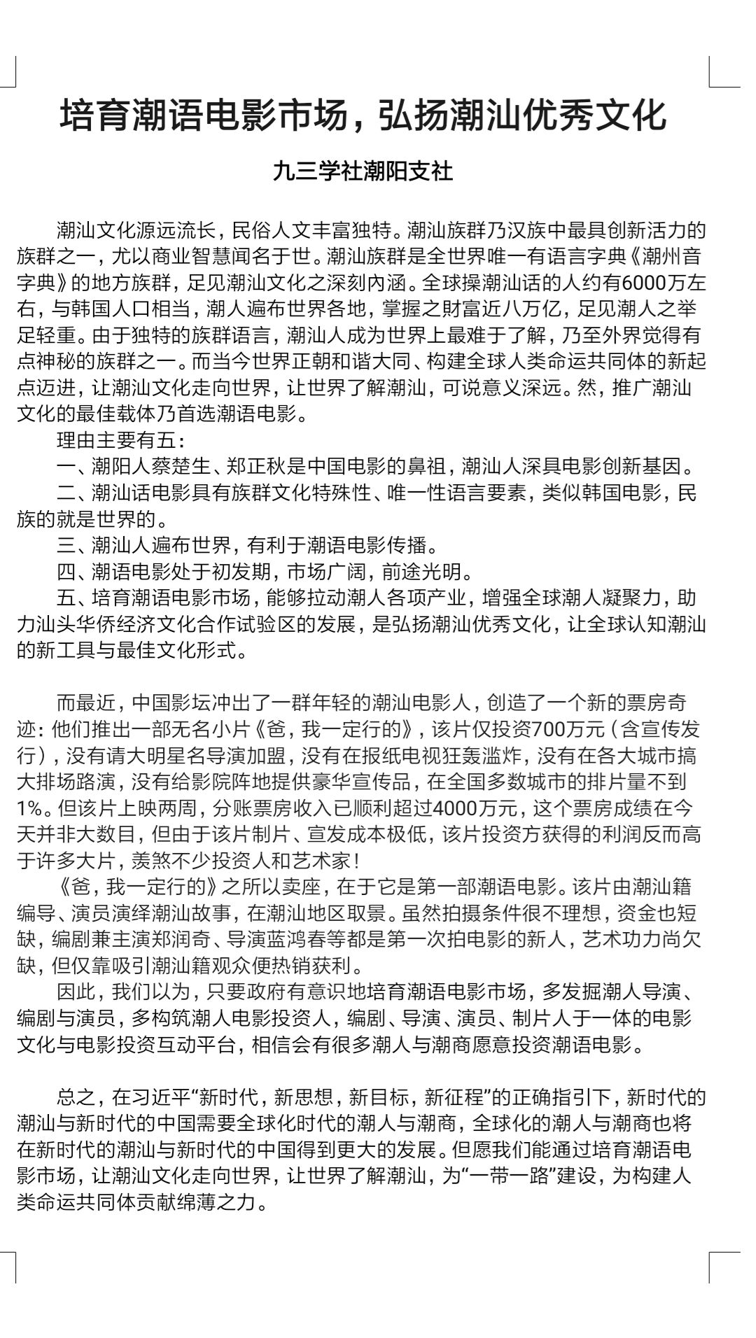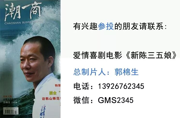 相信该片的影响力和商业潜力是非常看好的。这部电影我们已经启动创作流程,为使制作顺利进行,特邀您参与本片的投融资计划,共同推动这部有潮汕文化底蕴,有人文情怀,有商业潜力的电影的诞生,也请您推荐给有兴趣,正能量的朋友一起参与投资,分享红利。 潮汕胶己人,团结起来,我们在商业上闻名全国,这回要让全国人民除了知道我们会做生意,也会做影视文化!