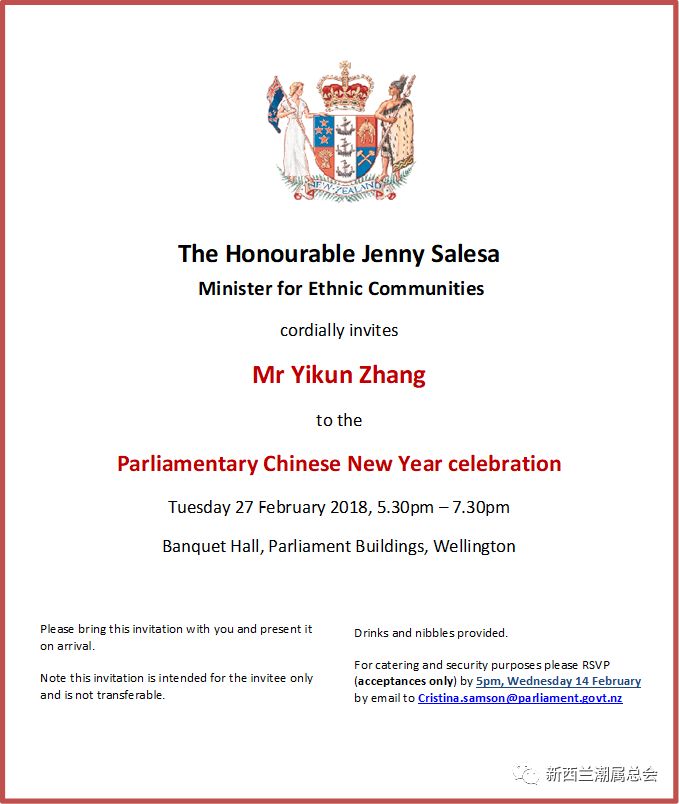 受邀出席本次新春招待会的有:国际潮团总会张乙坤主席、新西兰潮属总会会长郑时佳太平绅士、新西兰总会监事长王觉杰、执行会长兼新西兰潮属商会会长王锡钢、执行会长林盈、常务副会长黄敏仪、法律顾问陈萍、政府事务顾问洪承琛、副会长兼新西兰潮属青年联谊会会长陈植、新西兰潮属青年联谊会张晓杰及姚乐副会长。新西兰潮人同乡互助会会长陈堆贤及副会长陈国信也一同出席本次活动。 来自民族社区部的国会中国年庆典邀请函: