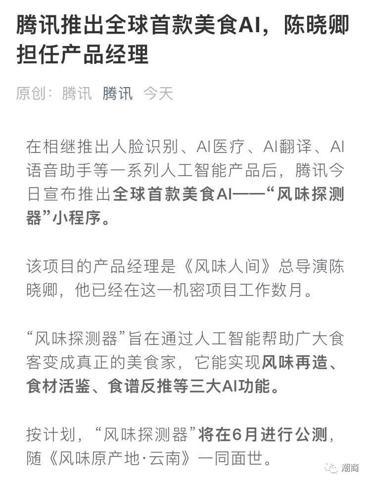 提示:点击上方"潮商"关注我们 今天一早,一条“腾讯推出全球首款美食AI,陈晓卿担任产品经理”的官方推文横空出世: ![]() 视频中,陈晓卿还煞有介事地回应了新职务和新产品。该新闻声称,将推出“风味探测器”AI技术,该技术吊炸天,还能1秒识别潮汕牛肉火锅里的肉是是吊龙伴、脖仁、匙柄、五花趾、或者胸口朥。 ![]() 是不是很惊喜?很意外?小伙伴表示内心毫无波动,拖到文章最下方,果然看到“祝大家愚人节快乐”的字样emmm... ![]() 为什么大家早已看穿了一切?因为去年今日,我们就被“鹅厂”坑了一次——