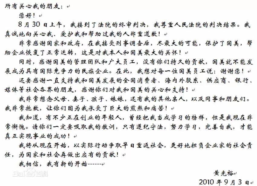 (黄光裕道歉和感谢公开信) 判决 2010年5月18日,一审判决:黄光裕犯非法经营罪判处有期徒刑八年,并处没收个人部分财产人民币2亿元;犯内幕交易罪判处有期徒刑九年,并处罚金人民币6亿元;犯单位行贿罪判处有期徒刑二年。数罪并罚,决定执行有期徒刑十四年,并处罚金人民币6亿元,没收个人财产人民币2亿元。以内幕交易罪判处黄光裕妻子杜鹃有期徒刑三年六个月,并处罚金人民币2亿元。以内幕交易、泄露内幕信息罪,判处许钟民有期徒刑三年,并处罚金人民币1亿元;以单位行贿罪判处许钟民有期徒刑一年,决定执行有期徒刑三年,并处罚金人民币1亿元。国美电器有限公司、北京鹏润房地产开发有限责任公司也因单位行贿罪分别被判处罚金人民币500万元与120万元。一审宣判后,黄光裕、杜娟和许钟民也一同提出上诉。 2010年8月30日,黄光裕案二审开庭,北京市高级人民法院二审裁定:黄光裕判决维持不变;许钟民的判决维持不变;杜鹃被改判缓刑,即被判处有期徒刑三年缓期三年执行,当庭释放。 2012年10月,黄光裕获减刑10个月。 2015年12月7日,刑罚执行机关以罪犯黄光裕获得2次监狱改造积极分子为由,建议将其刑期减去一年。 2015年12月11日,北京市第二中级人民法院对罪犯黄光裕减刑案件的基本情况公示。 2016年5月31日,黄光裕再次获减刑11个月。 国美争夺 肇端 2006年7月,黄光裕收购了陈晓的永乐电器,后者同时进入国美任职行政总裁。黄光裕被拘后,2009年1月辞去国美主席等身份(但依然是大股东)。陈晓接任执行董事兼董事局主席,把持董事会,开始“去黄化”,黄光裕案一审判决公布,黄、陈对国美的控制权之争瞬间白热化。 激战 逆转 2011年3月,陈晓辞任董事会主席、执行董事、执行委员会成员兼主席及授权代表职务;由张大中出任国美电器非执行董事及董事会主席。外界分析认为,这更多的是体现大股东(黄光裕)的意志,也意味着国美将回到“黄氏风格”大举扩张战略。 静待归来2015年乃至未来几年,国美都将继续深化全渠道零售商战略。吴咸建称,国美聚焦家电主业,过去的一系列改革已经取得初步效果,营收和毛利实现了多个季度的增长。 黄光裕是国美的英雄,更是国美的灵魂。正是这样一个理想无限扩张的人,让资本市场、国美管理层、员工及粉丝充满期待,寄望这位王者归来后,能重拾“做世界零售业第一”的壮语豪言。 杜鹃——这位与夫共患难的弱女子,也翘首以盼,静待丈夫归来。历经市场洗练,她已从“相夫教子”的角色蜕变为一个资本运作高手和零售高手,成为国美新的“定海神针”。 法律规定:实际执行刑期不能少于原判决刑期的一半。 律师分析:刑期过半后,有两个方法或可实现提前出狱,一个是减刑,一个是假释。 从2008年11月起算,到2015年11月,黄光裕的刑期正好过半。理论上,服刑期过半就可以申请假释。黄光裕并没有不符合假释的条件,但能否成功,还有很多不确定因素,要靠司法机关根据实际情况判定。 2016年5月31日下午,北京市二中院作出裁定,黄光裕在刑罚执行期间确有悔改表现,符合法定减刑条件,对其减去有期徒刑11个月。减刑后,其应执行刑期至2021年2月16日。据了解,这是黄光裕第二次减刑,2012年他曾被减刑10个月。 来源:粤A潮汕人 声明:本文不代表我们的观点,仅供读者参考。文章版权归原作者所有,如有侵权,请联系我们进行删除。 潮 商 文化的境界 · 财富的智慧