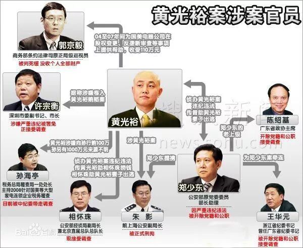 经济犯罪案发 2008年11月27日9点30分,北京市公安局新闻办证实: 黄光裕因涉嫌经济犯罪,正在接受警方调查。翌日晚,北京市公安局新闻办证实,北京新恒基董事长黄俊钦、北京中关村董事长许钟民,涉案被查。中国证监会通报:发现黄光裕的北京鹏润投资有重大违法违规嫌疑。2009年1月7日,北京公安局新闻办证实:黄光裕的妻子杜鹃因涉嫌经济犯罪,正在接受警方调查。2009年1月至2009年12月,公安部原部长助理郑少东、公安部经侦局原副局相怀珠以涉嫌在金融大案中受贿被中纪委“双规”。广东省原政协副主席陈绍基、浙江省原纪委书记王华元、深圳市原市长许宗衡、上海市公安局原副局长朱影等高官先后接受调查。2012年12月24日,北京检察院宣布:在审查中发现黄光裕等还涉嫌其他犯罪事实。 起诉 2010年2月12日,北京市人民检察院第二分院以黄光裕涉嫌非法经营罪、内幕交易罪、单位行贿罪向北京市第二中级人民法院提起公诉,对同案其他被告人及相关被告单位亦一并提起公诉。 2010年4月14日,黄光裕进行庭前示证;4月22日,一审公开开庭审理国美电器有限公司、北京鹏润房地产开发有限责任公司单位行贿和被告人黄光裕非法经营、内幕交易、单位行贿案。检察院指控:2007年9月至11月,黄光裕违反国家有关规定,非法买卖港币8.22亿余元;2007年4月至9月,黄光裕作为北京中关村科技发展(控股)股份有限公司的实际控制人、董事,在决定该公司与其他公司资产重组、置换事项期间,指使他人使用其控制的85个股票账户购入该公司股票,成交额累计人民币14.15亿余元。至上述资产重组、置换信息公告日,上述股票账户的账面收益额为人民币3.09亿余元。此外,2006年至2008年间,黄光裕作为国美公司和鹏房公司的法定代表人,为给两公司谋取不正当利益,直接或指使他人给予相怀珠等5名国家工作人员的款物折合人民币456万余元。