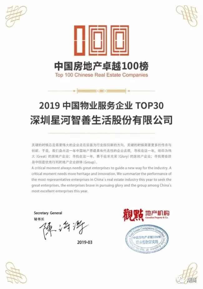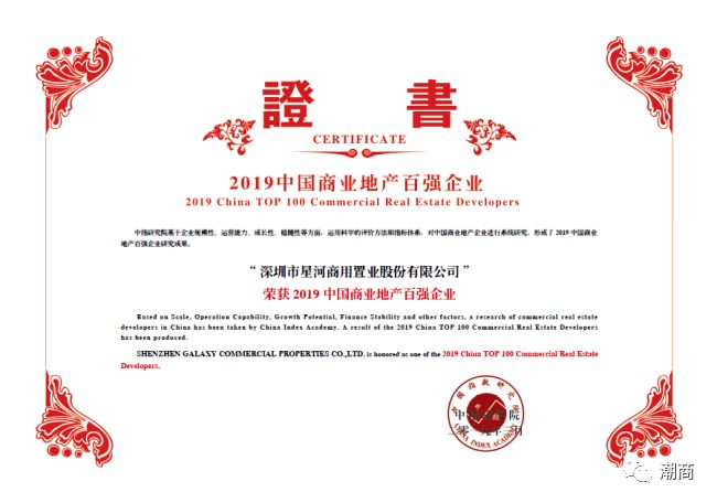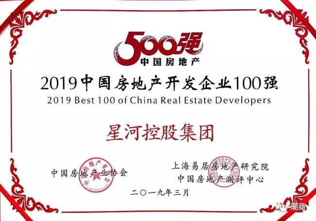 提示:点击上方"潮商"关注我们 近日,由国务院发展研究中心、清华大学房地产研究所和知名研究院共同组成的中国房地产TOP10研究组所发布的“2019年中国房地产百强企业”榜单公布。凭借出色的综合实力和良好行业口碑,星河控股集团连续八年成功入围百强之列。