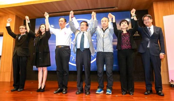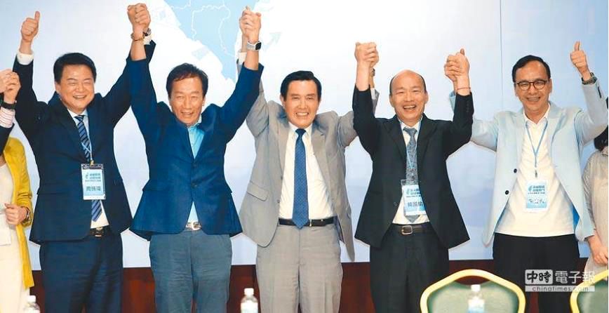从左到右:周锡玮、郭台铭、马英九、韩国瑜、朱立伦 针对路透报道说郭台铭要辞任董事长一事,鸿海已经郑重否认,且由郭台铭的助理胡国辉回应,郭台铭未来数月不会辞任董事长。