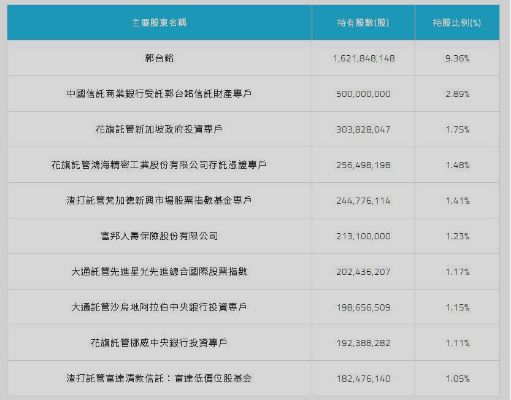鸿海集团主要股东 福布斯杂志今年3月公布的2019富豪榜上,现年68岁的郭台铭身价达63亿美元,为台湾首富。