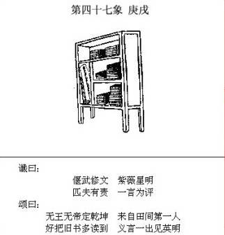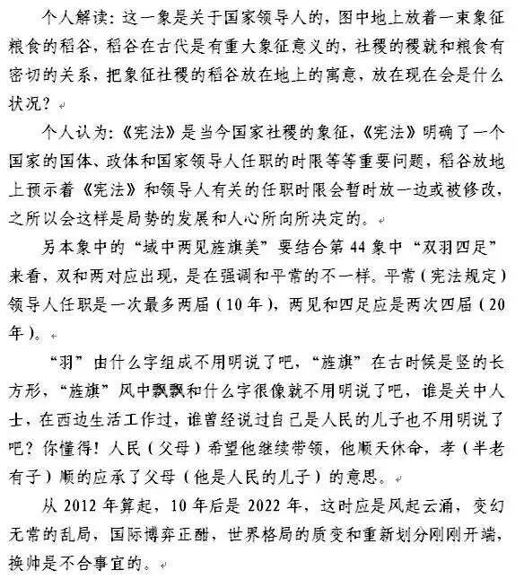 个人解读: 这象描述的是一种政治时局乱象: “水火相战”,意味着矛盾剧烈爆发,“时穷则变”,意味到了必须变革的时候;“白米盈仓不值钱”说明不是天灾,那就是人祸;“兽贵人贱”、“豺狼结队街中走”,说明黑暗势力的疯狂状态,这种疯狂必会引起“贱的人”的反抗来“拨尽风云”向光明靠拢。 从45象开始局势发展到这里,日本、半岛、琉球都已说到了,那这种乱象就只可能发生在台湾。 第43象,说的是台湾,这点相信大家都没疑问,其实第40象也和台湾有关系,但台湾问题一直没有解决,在这里再说并不矛盾。 2016年12月17日前南京军区副司令员王洪光在环球时报年会上的表示:两岸将在2020年前爆发冲突。 也就是说2020年左右是台湾武统的关键节点,按正常的理解,解决了日本,半岛发生改变、经历了琉球对峙,到了这个时候台湾应该早统一了,怎么这象说的还是台湾乱象,局势会按新闻里表述的那样发展吗?我看未必,还是从第43象说起。 在第43象里对台湾问题说到“始艰危,终克定”,艰危指的是什么? 当美控制不住东亚局势时,日本拥核和台湾独立大概率会同时发生。但资本远比我们想象的要黑恶,个人认为台湾在宣布独立前宣称研制出核武也是大概率的事,以核拒统,统一台湾之战,台湾没有核武谈的上“危”吗? 一个国家的内战、统一之战面临核战的风险! 闻所未闻! 这样的情况才符合43象提到的“始艰危”和“欲尽不尽不可说”的意境。 如果台湾在2020年或2021年宣称拥核后宣布独立,面对这样的情况中国必须做一个选择,是马上武力统一还是先缓一缓? 这个问题的答案是由整个东亚局势的主要矛盾发展趋势决定的。 就在本文的写作中,有这么两件新闻,耐人寻味,2017年1月7日,蔡英文过境外交抵达美国休斯敦,7日是美国当地时间(美国时间和北京时间相差12小时);8日各大网站都在新闻版面靠前的位置以“台前军官:台曾计划用战机带核弹自杀式炸大陆”和“台叛逃核专家:台湾曾想对大陆发动自杀核攻击”等类似标题报道台湾《自由时报》8日报道,张宪义在这本名为《核弹!间谍?CIA:张宪义访问记录》的书中称,当年虽然台“中科院”明确告知在美方介入下,台湾被迫不能研发地对地中程弹道导弹,但这不代表在研发完成核武后,台湾就没有能力将核武投射到大陆。 这两个信息联系在一起充满了诡异和警示的味道:当年美国介入,台湾没能完成核武,反过来说就是,现在美国改变主意再介入,台湾就能完成核武!一切以美国的利益需要为前提。 接下来有必要说说2016年12月13日环球时报社评提到的一句话“我们需要有能力在必要时将台湾‘ 黎巴嫩化 ’,并且让通过武力彻底收复台湾成为真实的选项之一。” 何谓“黎巴嫩化”,简而言之就是敌对势力支持下的长期的内战或者说内乱。 为什么会对台湾要有长期的内战或战乱准备? 这是由统治基础决定的,打下一个地方容易,但要治理一个地方就不是那么简单的事。 台湾离开大陆从1895年《马关条约》算起有到2020年有125年,从1949年国民党败退算起到2020年有71年,台独思想及台湾民众与大陆的隔离尤其是心理上的隔离情绪不是短时间内造成的,是长期以来各种势力及风云变幻不断累积的结果,要想在短时间内消除这种心理隔离状态在和平和平和的条件下是不切实际的。 个人看来,台湾如果发生内战或内乱是两种表现形式,内战代表了武力统一的情况,武统台湾只是内战的表现形式之一,形式上统一后的台湾就能太平了吗? 未必,只要岛内依旧存在独派份子,外部干预势力依旧存在,台湾就太平不了,香港就是活生生的例子,而台湾远比香港要复杂,狭义的“黎巴嫩化”是难以避免的。 一旦武统,而外部干预势力没有弱化则台湾势必成为中国消耗实力的伤口。 内乱代表了兵临城下情况,台独势力的外部支援主要有两处,那就是美国和日本。 解决日本,美国的西太平洋完全框架解体,台湾的独立能走多远? 另外,从矛盾发展的角度看台独力量在岛内会是一个什么情况,矛盾的一个重要特性就是矛盾的发展方向到了一定的程度会出现转化,不妨来设想这么一个场景,一座孤城被围住了,指望援助撑腰的两只力量各怀鬼胎,一支本就不打算出力,坐山观虎斗,指望另一支去消耗围城队伍的力量,结果另一支队伍被消灭了,被围在城里的人会是什么样的心态? 失望?绝望? 那么城里的人除非都有鱼死网破的必死之心(台湾人会有吗),否则必会出现分化,而且时间越久分化越明显,不用围城的力量攻城内部会斗起来,寻求和围城力量和解。 这是广义的“黎巴嫩化”,只有经历了广义的“黎巴嫩化”和东亚风云的变幻,台湾岛内民心才会有在短时间内转变的可能。 台湾独立走上一段距离,而中国集中力量打击东亚变局的七寸,外部干预势力被打击,内乱势必会将这个脓包挤破。 个人都能看得出台湾宣布拥核独立(或是无核宣布独立)是在为日本拥核打掩护做准备,以牵扯分散中国的聚焦,国家能不看的出?事态会按照敌对势力希望的那样发展? 正所谓你搞你的,我打我的。 所以情况大概率是对台湾武统之事缓一缓,直接釜底抽薪,把美放手台湾拥核和独立的怒火全撒在美国的亚太基石日本身上。 同样是打仗流血,面临核战的风险,实在想不出有什么理由要打内战而又不解决中国面临的亚太难题,难道要便宜成全了日本在拥核形成核威慑后来和中国作对? 在问题