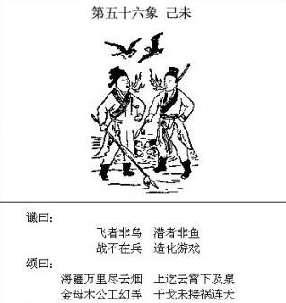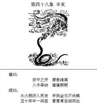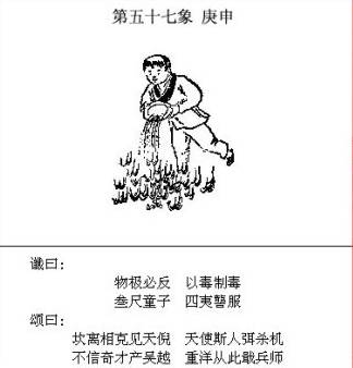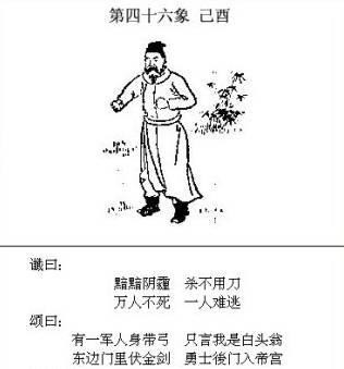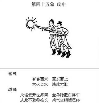 个人解读: 这一象说的是对日战争,以前有人解读过,相信大家对这一象的这个问题没有什么疑问。文中的内容很白话,好理解。 “炎运宏开世界同”,炎黄子孙中华文化在全世界弘扬开来,得到了全世界的认同; “金乌隐匿白洋中”,金乌,古时对太阳的称呼,如果日本膏药旗,没了太阳,自然成了白旗,说明日本投降了。 “从此不敢称雄长,兵气全销运已终”,日本再也不敢有野心了,没了军队(估计连自卫队也没有了),国运从此衰落。 那么为题来了,图中有两人持枪刺向太阳,问题有三:和谁因何事在什么时候? 先解读中国和谁向日本发动战争的问题? 无疑是俄罗斯,原因有二: 1、从地理地图上看,日本的周边只有台湾地区、中国、韩国和俄罗斯,台湾和韩国被美控制,不可能对日出手,除了中国只能是俄罗斯。中俄从两头夹击,日在劫难逃。 2、从棋手博弈的大势来说,中俄都想维护自己的利益,把美国美元霸权斗趴下,支撑美国霸权的三个安全框架是北约、西太平洋安全框架和中东安全框架,这三个安全框架从哪里解体对棋手的影响是及世界局势的发展及后续影响大不一样的。 从中东解体,美俄顶牛打架,对中国是最有利的;从西太平洋解体是中(俄罗斯帮衬)美顶牛打架,对俄罗斯是最有利的,俄罗斯乐于配合中国。 因何事动手? 1、目前东亚局势总统还保持相对的稳定,暂时还乱不了,乱只有在两种可能性下出现:一是中国不行了,控制不住局势;二是美国不行了,控制不住局势。 这一乱当是大乱,不是一点爆发,二是多点爆发。 我一直有这样一个观点:美的实力在持续走下坡路,但当实力不足以维持一超地位时,欧洲、中东、东亚这三个维持美一超地位的重心将会出现“取舍”的局面。 欧洲和中东相邻,中东紧邻非洲大陆,石油等资源丰富,各种矛盾盘错远大于东亚,且各种矛盾的实力都不强大,美操盘余地很大,而中东和欧洲一直是美控制世界的重中之重,当实力受挫东山再起必须依靠这两个地方。而东亚与这两个重心地理上相距甚远,且有一个综合实力强大、执行力坚决的中国,除非美有把握对中一战定乾坤,否则真到了取舍之时,取易舍难,东亚被“舍”将是大概率的事。 国际局势发展到要对日本用武,说明美实力难以支撑霸权,面对中国的发展,遏制手段已黔驴技穷,准备放开栓日本的狗链,让日本出来和中国叫板。 同时,更说明美资本势力在博弈中做出被动中的主动选择,力保中东和欧洲方向,在中东和欧洲方向会有大动作,需要一个着力点来牵制中国,防止中国在这个方向坏其大事。 对日动武最大的可能性是日本拥核。 如果任由日本拥核,并任其发展,中国面临的局面将会是才斗跑一只虎,又来了一头狼,日与台独势力渊源深厚,琉球问题的解决也可能遥遥无期,以日目前的政治生态而言,难保中日日后不会有一战,日现存的核材料就够制造一千多枚核武器,如果中日此时再战,将付出极大代价,中国的崛起将毫无希望可言,日拥核形成核威慑后对中而言后患无穷,必须将其掐灭在萌芽状态才符合中华的最大利益。 美国放手日本拥核前,必会全盘考虑之后的影响和各方可能反应,中方不动手,可以用日牵制中国,中方动手,可用日消耗中国。 2、中国的现实实力和国家安全需求不允许在美霸势力退出东亚前出现一个美霸的替身打手,这个打手核军事一旦深度发展会打破战略平衡,在安全上严重威胁中国,一个美霸就够了,何况这个替身打手在历史上严重伤害过中国且拒绝反省并不断为历史翻案。 如果任由不思悔改的日本拥核壮大,东亚局势将会变得更加复杂,半岛问题、琉球问题将会错失解决良机,台湾统一后也会存在诸多后遗症,日本是中国解决整个东亚问题的关键劫点,这个劫点被敲,东亚全局皆活。 最后说什么时候? 2020-2021年左右(2021的可能性最大),这个时间是从第48象(琉球问题、这象明确说明了时间段)倒推而来,只有日本被解决了才会出现48象49象描述的局面。