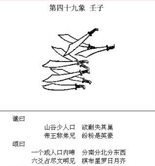 个人解读: “山谷少人口”这句指的是一个地方,山就是山,谷少人口说的是八,图中八把刀叠起来就是重,合起来就是指琉球的八重山群岛。 “欲剿失其巢”指八重山群岛民众不满美的军事占领率先对美发难,琉球其他各岛跟随。 汉字真是太精妙了,五个字不光包涵了字谜,还完整描述了局势的发展。 “剿失其巢”为刀,引申为武力;“巢”引申指的军事基地,欲对军事基地进行围攻,因中国俄罗斯站在这股力量的背后,基地见大势已去,又或是在中东方向有图谋,不战自退,美军彻底退出东亚。 “或”加“口”为繁体“國”字,预示着琉球建国,“棋布星罗”和那些岛蛮对应的。