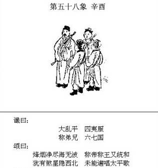 个人解读: 这一象里出现五个男孩在赶一头大牛,纵观前象,男孩代表了国家或某一地域,五个男孩(国家)同时在驱赶一头牛(大国),说明这五个国家和这大国平时关系非常密切,不然不会同时做出相同的动作和行为。 在中国周边,除了中亚五国和俄罗斯,个人实在找不到其他对应的国家。 局势按照上述逻辑发展,东亚中国搞定日本,安抚半岛,摆平琉球,解决台湾,博弈大势已定,所以“磊磊落落,残棋一局”,东亚全面摆平,对一路一带战略的实施地的沿途国家将是震撼的,站队的国家将陆续出现,中国的复兴将是陆权的复兴,陆权必牵涉中亚。 中亚自二战后就是苏联的势力范围,后被俄罗斯继承,在中俄合力斗美阶段,中国的一路一带战略涉及中亚阻力相对是较小的,但在斗垮美霸势力后,俄为了自身的利益,加上欧美资本势力的介入,必会改变之前在中亚的策略,可以想见的是策略的改变和实施是需要实力支撑的,欲截断中亚五国现成的发展发财之路,就必须给人家指明一条可行新的发展发财之路,如果不能,中亚五国站队将是必然的选择。 另欧美资本势力在中亚的兴风作浪也将促使中亚五国做出站队的选择。 “啄息茍安”,鸟用嘴取食取东西称啄。 这四个字描述表达的是一种生存状态,明显是很不好的生存状态。 是什么导致了俄很不好的生存状态,比现在还差? 这里不妨顺着导致前述各象发生的原因即背后的发展逻辑进行合理推导。美国放手台湾(拥核)独立和放手日本拥核的原因和目的: 一、美国的金融(债务、政治)等综合危机导致美霸权难以为继,必须在霸权完全萎缩和坍塌前进行筹划部署,美资本势力视中国的崛起为其最大的挑战和敌人,以台湾独立和日本拥核作为牵制及寄予打击中国的手段,目的是企图迟滞、阻挡中国的崛起,同时掩护中东和欧洲方向的行动。 二、中东和欧洲是资本寄予重新崛起的根本,昊天(昊天经纬)的框架指出美欧资本目前正在合流(或转移)博弈中,观察点就是巴以和谈的主导权问题。 结合《推背图》前后的预测,欧美资本合流(或转移)达成一致或妥协将是可以预期的,一旦资本合流(或转移)正式开始,地球的大乱也将开始! 合流(或转移)意味着原有的国际政治格局将出现重大改变,合流(或转移)是一个过程,过程就意味着没有成型,是最虚弱最没有力量的时候,为了保证自己预期的利益不被其他棋手势力瓜分、侵吞,就必须给其他棋手制造大障碍大麻烦,使得这些棋手没有力量和精力来瓜分、侵吞自己的预期利益。 在东亚给中国制造的就是台湾独立和日本拥核,在俄罗斯周边除了乌克兰继续发酵外,高加索地区,中亚地区(费尔干纳盆地)等问题矛盾集中的地方大概率不会幸免。 “虽笑亦哭”,俄罗斯斗趴了压在身上的大敌美霸,总体安全了,当然是笑;可之后自己周边问题矛盾不断爆发,利益不断流失,保不住中亚,就该哭了。