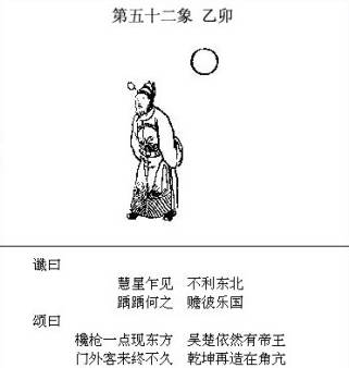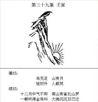 「鸟无足。山有月」是在暗示侵略中国的国家是个「岛」国。「鸟」除去四点的脚,再放进「山」字,就是个「岛」字。山有月是个崩字,暗示日本必败。 「旭初升」是暗示日本恰似旭日初升正发挥其国威的时候。 「人都哭」暗示日本大举进犯中国大陆,四万万同胞遭受残害,苦不堪言之状。南京三十万人大屠杀是日本残害中国人,人数最庞大的一次惨案。 颂曰第一句「十二月中气不和.南山有雀北山罗.」是暗示偷袭珍珠港的十二月八日。「气不和」一则指日本与美国谈和而却猛干其后背的行为。一则暗示日本自从一九四一年的十二月后,恼怒了美国,战事开始走下坡。 颂曰第三、四句「一朝听得金鸡叫。大海沉沉日已过。」是在暗示西元一九四五年的日本投降。 如果说仅仅一象能解释通,那么你或许会认为是偶然,那么已经发生的所有“象”都能和已经发生的历史符合上呢?连顺序都能符合,那还是偶然么?
