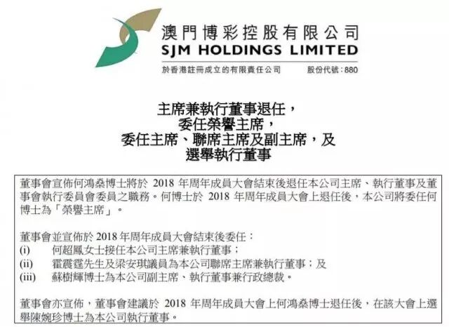 提示:点击上方"潮商"关注我们 澳门风云落幕! 继上个月李嘉诚宣布将退休后,有着 " 澳门赌王 " 之称的何鸿燊也即将隐退历史舞台。 4 月 12 日晚间,澳门博彩控股有限公司(以下简称澳博控股)发布公告称,现年 96 岁的何鸿燊将于 2018 年 6 月 12 日卸任公司主席。早在去年,何鸿燊已退任旗下信德集团的行政主席,此次再次退任澳博控股主席,意味着他即将完成所有的交棒工作。