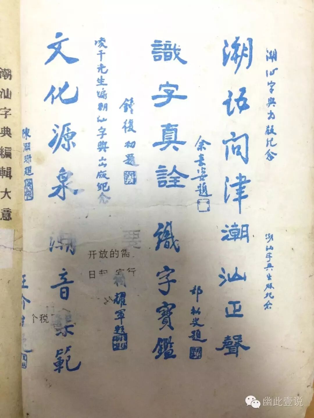 名人撰文或题词推荐 1935年9月,《潮汕字典》由汕头育新书社首版发行。著名学者、书法家、国民党元老、当时的监察院长于右任为其封面题签。当时的潮汕文化教育界及政界名人余命三、钟麟、钟岐、周英耀、李柏存、钟复初、李源和等为该书题词祝贺。 此书一面世,便受到读者的热烈欢迎,首版即发行达1.5万册之多。在80年后的今天看来,这也是个可观的首版数字。翌年,陈凌千获专著版权,并获汕头市政府批准注册。后来,陈凌千的育新书社迁址开设广益书局,并与上海人在汕头开办的中央书局、新华书局合资再版此书。新版的《潮汕字典》在上海出版后,35%南运潮汕本土销售,其余部分则远涉重洋,运往东南亚各国潮人聚居地出售。 据不完全统计,从1935年初版至1946年,《潮汕字典》再版达17次之多,印数近70万。50年代中期还曾改为小32开袖珍本,以潮汕编辑社名义再版,由潮汕各地新华书店发行,仍被抢购一空。今天在潮仙流传较广的吴华重主编的《普通话对照潮州音字典》和李新魁主编的《普通话、潮州话常用字典》。由于问世较晚,印数也远不能达到这个数字。