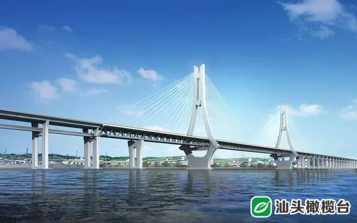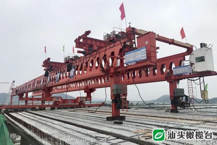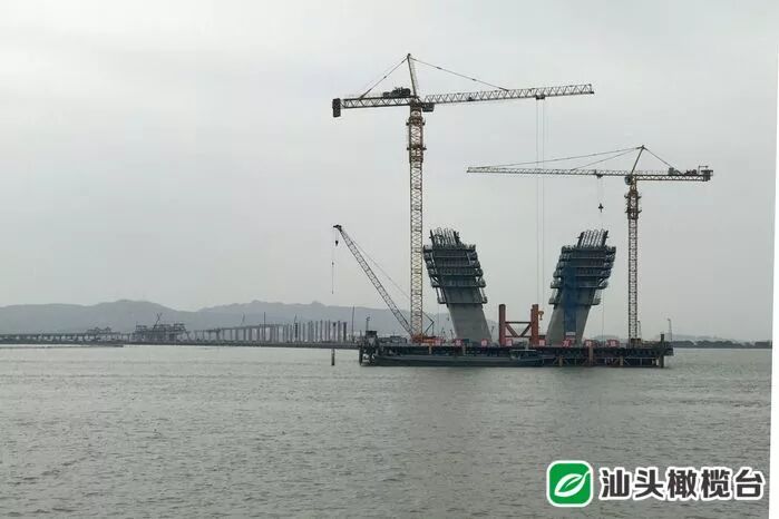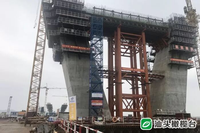 在榕江特大桥施工现场,榕江南北岸两座对望的主塔已初具气势。榕江特大桥是潮汕环线高速公路主要的工期控制性工程,总长4840米,是汕头市榕江两岸又一重要的交通大通道,主桥为双塔双索面钢箱梁斜拉桥,主塔设计为“倒梯形+倒Y型”,高度近146.9米,相当于38层楼高,这个高度是汕头各座大桥主塔高度的新纪录。