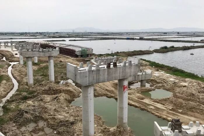 据了解,该段的施工难度大大超出预期,由于该标段施工用地全部位于鱼塘养殖区,导致便道填筑施工、深层淤泥桩基施工、鱼塘软基段现浇箱梁施工以及防止施工泥浆和填土对鱼塘造成污染难度都非常大。