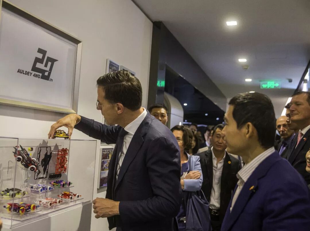△蔡总介绍奥飞四驱车产品后,首相开始亲自测试 不仅如此,在经过产品设计部门时,吕特首相亲自体验了四驱车、悠悠球、陀螺等产品,更是走进办公室和设计师攀谈起来,详细询问奥飞产品背后的故事。设计师回复称,除了精品内容和多元产业外,奥飞的产品都会在大众的认知的产品和功能上进行创新,打造出独特的体验。 作为荷兰媒体团代表,荷兰国际新闻电视台记者邓达斯则是对奥飞的媒体、授权、乐园等产业颇感兴趣,他表示,之前只在荷兰看过超级飞侠动画,这次参观后,奥飞的产业规模之大是他没有想到的,他也希望奥飞加快国际化步伐,让荷兰人民享受到更多优质的产品。
