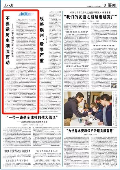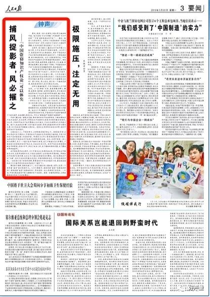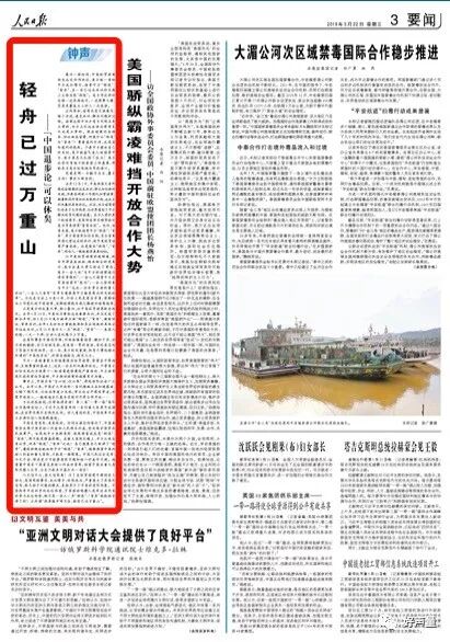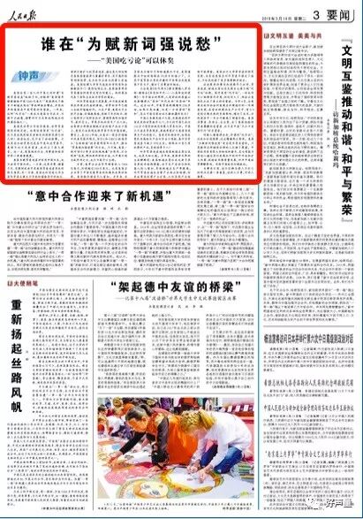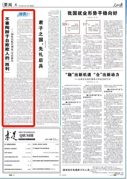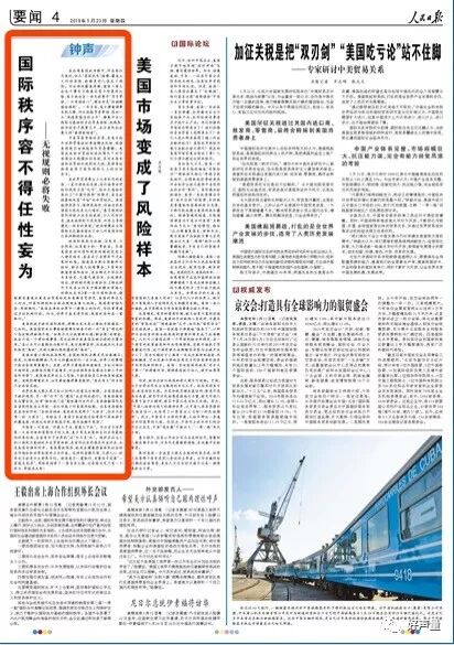 3月14日第三版头条三栏标题位置,16日第四版右上单栏坚标,其他均第四版左上一栏标位置。真可谓是形式统一。虽然在5月23日,在同样的版面上,以同样的版式,以同样的署名(钟声)发表了题为《国际秩序容不得任性妄为》对美国的评论文章,但是副标题不再是“可以休矣”。