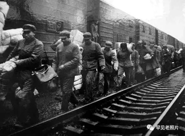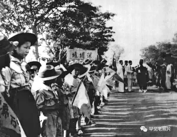 1949年10月,居民在车站欢迎解放军接管深圳,背后可清晰地看到当时深圳火车站的站名"深圳墟"。
