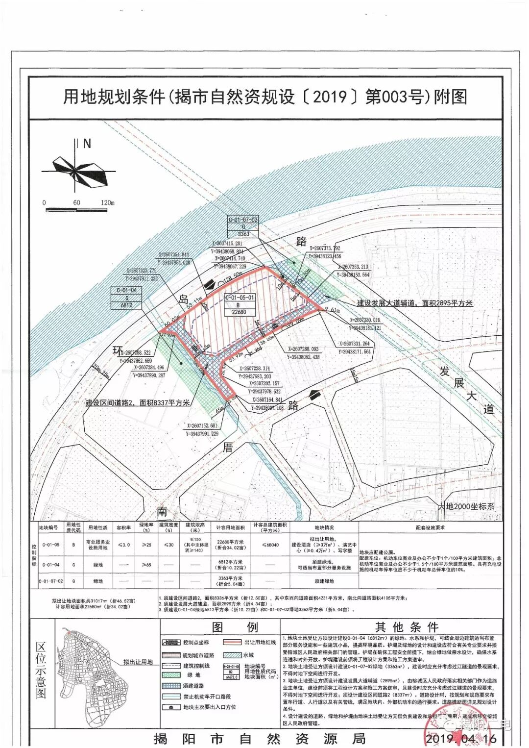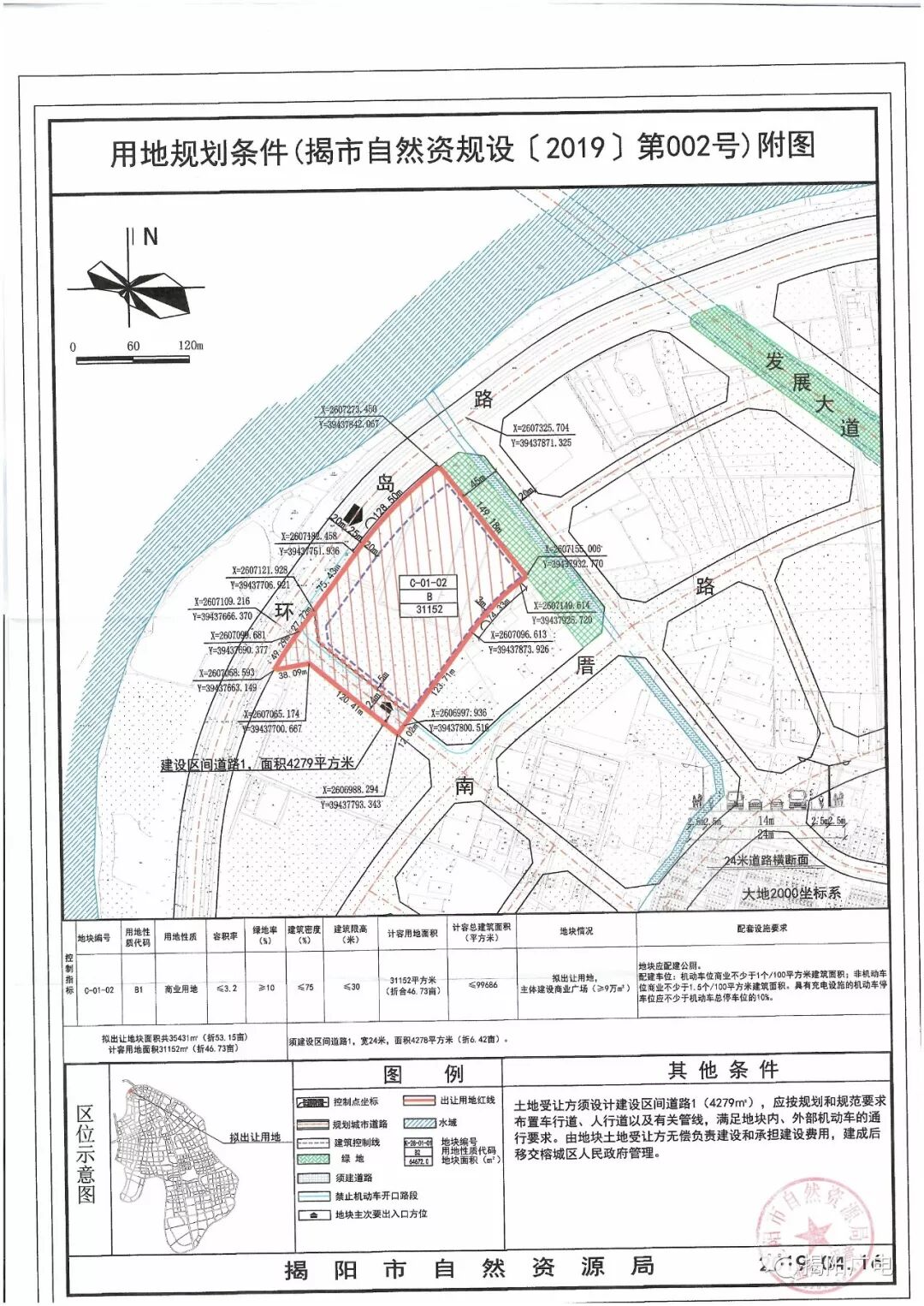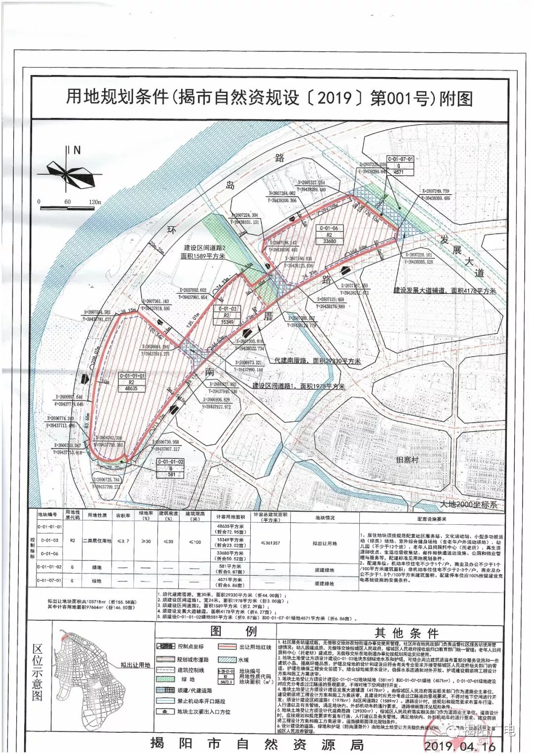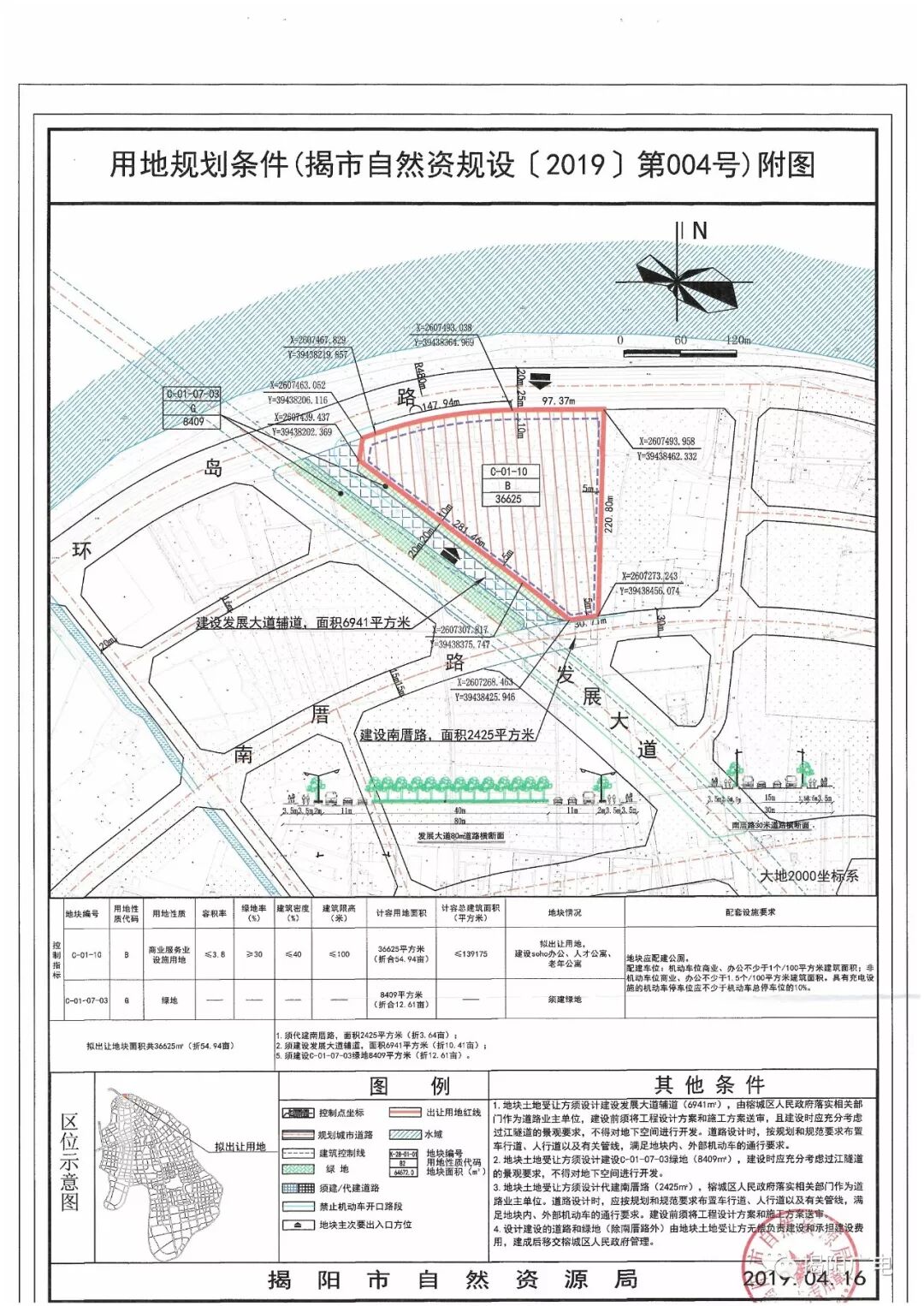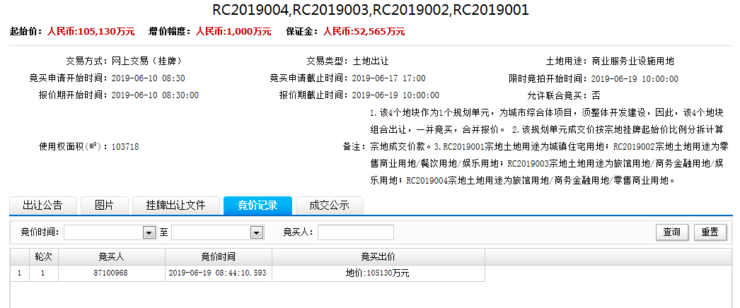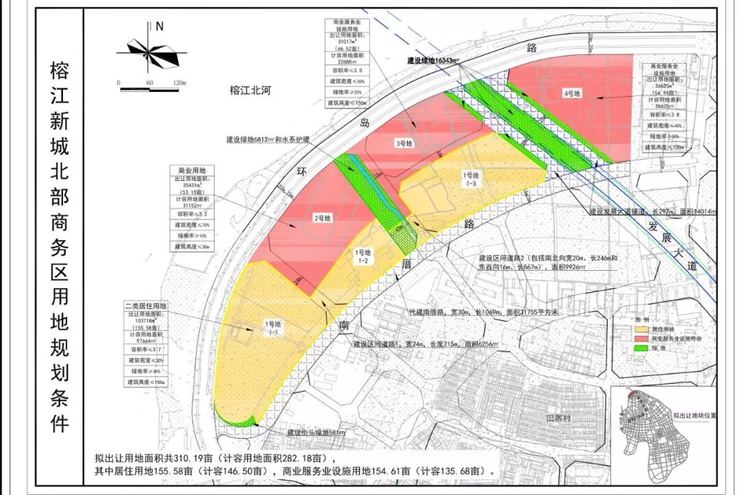 本次挂牌出让的地块编号为RC2019001、RC2019002、RC2019003、RC2019004,四块地块组合为一个单元总体出让,总出让土地面积206791平方米,约310.5亩,总计容建筑面积668258平方米,总起拍价105130万元 地块信息: 宗地编号:RC2019001 宗地位置:榕江新城环岛路以南、南厝路以北、发展大道两侧 宗地性质:居住用地 宗地面积:103718平方米 宗地出让年限:70年 宗地土地容积率:≤3.7 宗地建筑物限高:100米 宗地起拍价:81670万 宗地编号:RC2019002 宗地位置:榕江新城环岛路以南、南厝路以北、发展大道两侧 宗地性质:商业用地 宗地面积:35431平方米 宗地出让年限:40年 宗地土地容积率:≤3.2 宗地建筑物限高:30米 宗地起拍价:7780万 宗地编号:RC2019003 宗地位置:榕江新城环岛路以南、南厝路以北、发展大道两侧 宗地性质:商业服务业设施用地 宗地面积:31017平方米 宗地出让年限:40年 宗地土地容积率:≤3.0 宗地建筑物限高:150米 宗地起拍价:5240万 宗地编号:RC2019004 宗地位置:榕江新城环岛路以南、南厝路以北、发展大道两侧 宗地性质:商业服务业设施用地 宗地面积:36625平方米 宗地出让年限:40年 宗地土地容积率:≤3.8 宗地建筑物限高:100米 宗地起拍价:10440万