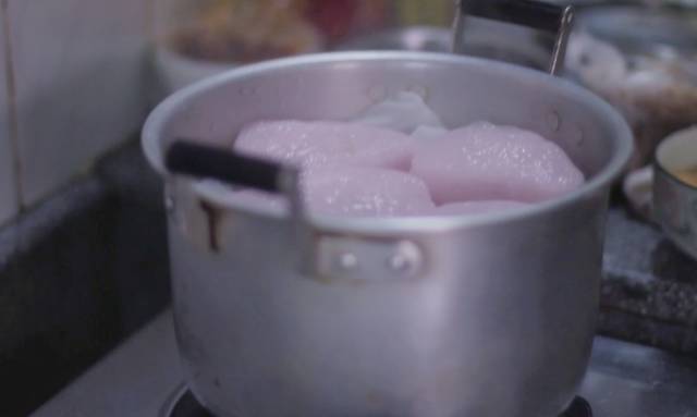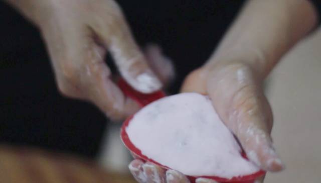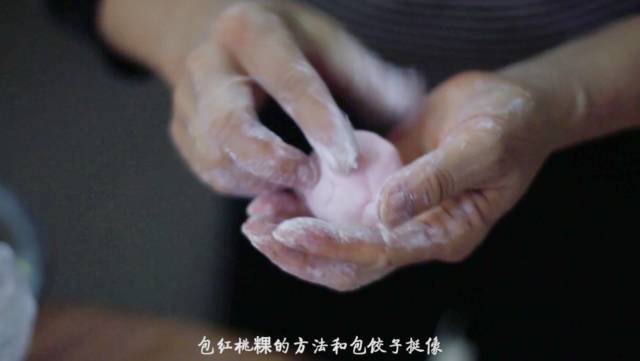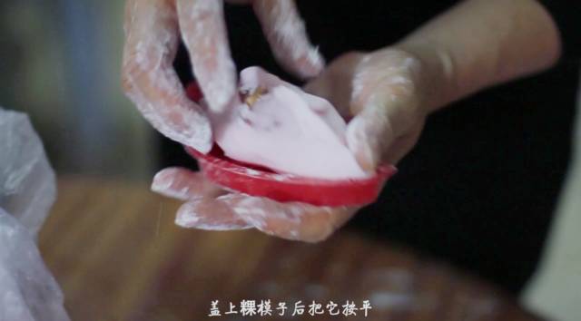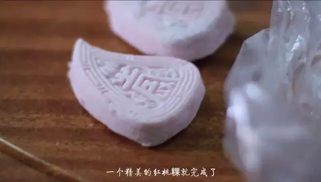 搓成球后用擀面棍抡平,加入两大勺内馅,将它包裹成圆锥状,盖上粿模子后把它按平,一个精美的红桃粿就完成了。 三 制作完成