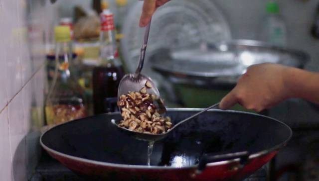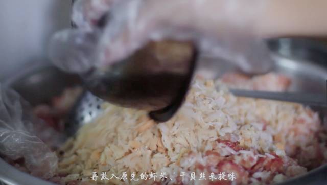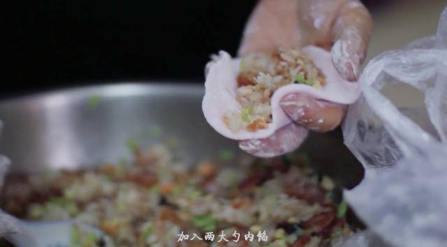 红桃粿做法简单,但材料的准备工作却很繁琐。先要蒸熟米饭,要将准备的腊肠切成片,再将香菇剪小块,把干贝碾碎成丝,还有切碎虾米等等。这些步骤看似简单,但却很考验刀功和耐心。 二 包红桃粿