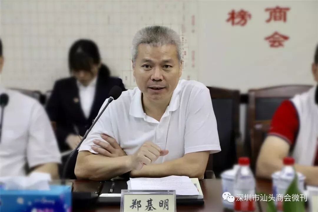 汕头商会郑基明会长发言 郑基明会长感谢了汕头保税区党委书记、管委会主任陈胜全一行百忙之中的莅临指导。他表示,在商会成立的近七年里,在创会领导的辛勤带领及全体商会成员的共同努力下取得了优异成绩。每次家乡领导的到访,总能感受到浓厚的家乡情怀。无论身在何地,全体商会成员始终心系家乡,关注家乡发展,积极参与家乡建设,热心家乡公益事业。