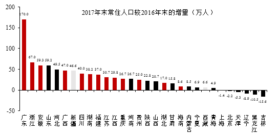尽管人口是影响宏观经济的中长期变量,且人口流动相当缓慢,但短期观测人口流动的痕迹,仍能在一定程度上反映出中国经济区域格局的细微变动。从2017年人口数据来观察,中国区域格局三大变化值得关注: 【1】“东西差距”正在转向“南北差异”,东北、西北和华北的人口明显出现净流出。在传统的“东中西”区域视角下,2017年中部、西部省份常住人口增长迅猛,似乎能得出中国人口分布趋于均衡的论断。若以“秦岭-淮河”一线做南北的分隔线,会发现常住人口增长集中在中国南部,而北部省份明显偏弱。因此,非均衡发展的态势仍然存在,只是表现形式正从以往的“东西差距”转向“南北差异”。