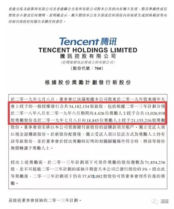 提示:点击上方"潮商"关注我们 腾讯再次对员工做出股权激励。根据最新计划,腾讯将发行新股3418万股,并同时售出大约219万股期权。 腾讯控股日前发布公告,称根据股份奖励计划发行新股份,合共3418.2万股新股,包括2018年8月-2019年6月期间向4426位奖励人士授予合共1302.7万股奖励股份,以及2019年7月8日向18845位奖励人士授予2115.5万股奖励股份。 ![]() 根据公告,腾讯本次获得股票奖励的人数为23271位。员工不必支付对价,将无偿获得上述股票。以腾讯盘中股价349.6港元计算,2115.52万股奖励股份共计119.5亿港元,人均奖励约51.5万港元(约合人民币45.25万元)。 授予各奖励人士的奖励股份数目则由各奖励人士的职位、经验及表现决定。 ![]() 腾讯2019年第一季度财报显示,截至2019年3月31日,腾讯有54623名员工,本次获得股票奖励的员工占比约为42.6%(23271名员工)。 腾讯历史上多次对员工做出股权激励。以腾讯“二号人物”公司总裁刘炽平为例,于2005年加入公司,2006年担任总裁,2007年开始担任执行董事。根据wind资料显示,刘炽平在2011年以前,还不持股腾讯。但从2011年开始刘炽平陆续获得公司股权,截至到腾讯发布2018年报时,刘炽平持股数量为4918万股,同时他还从公司领取薪酬为3.13亿元。 刘炽平(左二)与马化腾(右二)共同出席活动 以刘炽平对公司的贡献,上述股权大多数应该是公司无偿授予,而不是需要支付行权价的期权。 本次公告称,在授出上述奖励前,基于2013年股权奖励计划,腾讯可用作奖励的股份总数为71854236股。而在此次授出奖励之后,该计划还剩下37672082股股份可用作奖励。 同一天,腾讯还发布了授出购股权的公告。据披露,腾讯董事会于7月8日授出2188900分购股权。 资料来源:新浪财经、究竟视频等 声明:本文不代表我们的观点,仅供读者参考。文章版权归原作者所有,如有侵权,请联系我们进行删除。 潮 商 文化的境界 · 财富的智慧