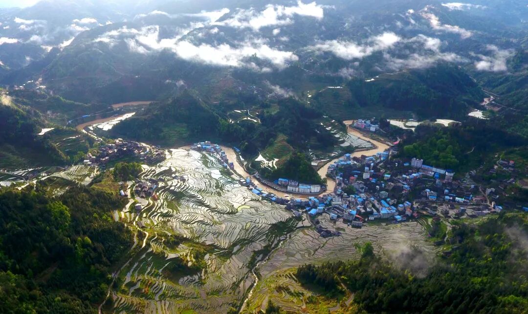 这是广西融水苗族自治县杆洞乡杆洞村的梯田(4月16日无人机拍摄)。新华社记者 黄孝邦 摄