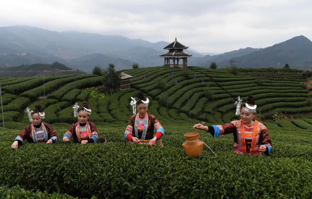 在广西三江侗族自治县八江镇布央村,几名女子在采茶(2017年2月23日摄)。新华社记者 陆波岸 摄