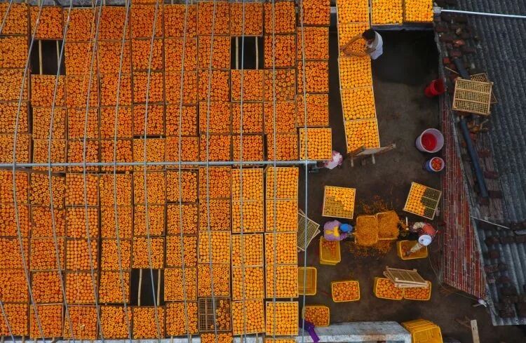 2018年10月17日,广西桂林市平乐县沙子镇渡河村农民在晾晒柿子(无人机拍摄)。新华社记者 黄孝邦 摄