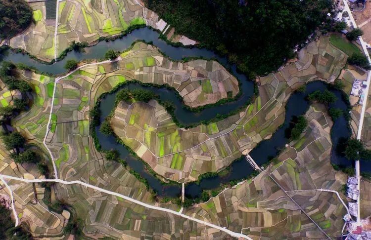广西东兰县武篆镇江平村山中小平原的稻田,月亮河蜿蜒田间(2016年4月13日无人机拍摄)。新华社记者 黄孝邦 摄
