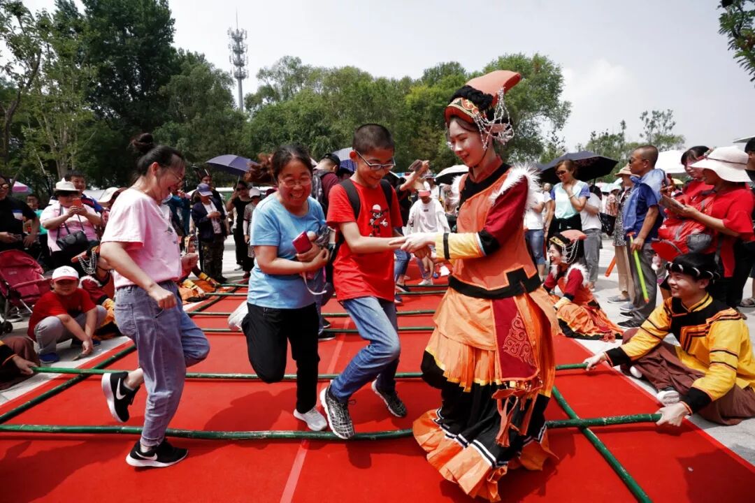 7月18日,游客在北京世园会广西园前体验竹竿舞。新华社记者 鞠焕宗 摄