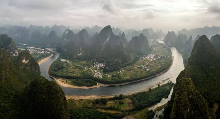 这是广西桂林阳朔县兴坪镇的漓江景色(2018年10月18日无人机拍摄,拼接照片)。新华社记者 李鑫 摄
