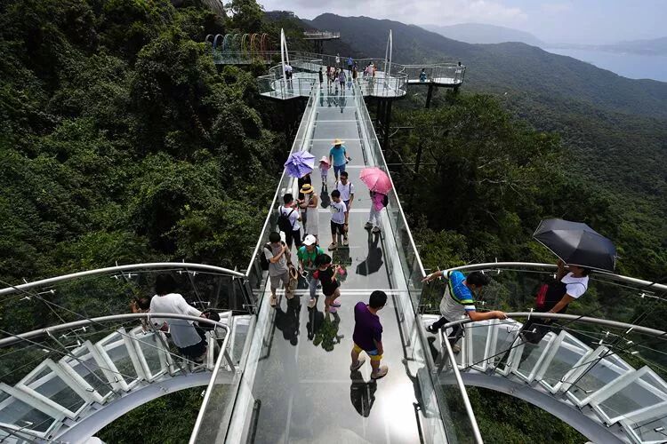 游客在三亚市亚龙湾热带天堂森林公园的玻璃栈道上参观游览(2018年8月31日摄)。新华社记者 郭程 摄