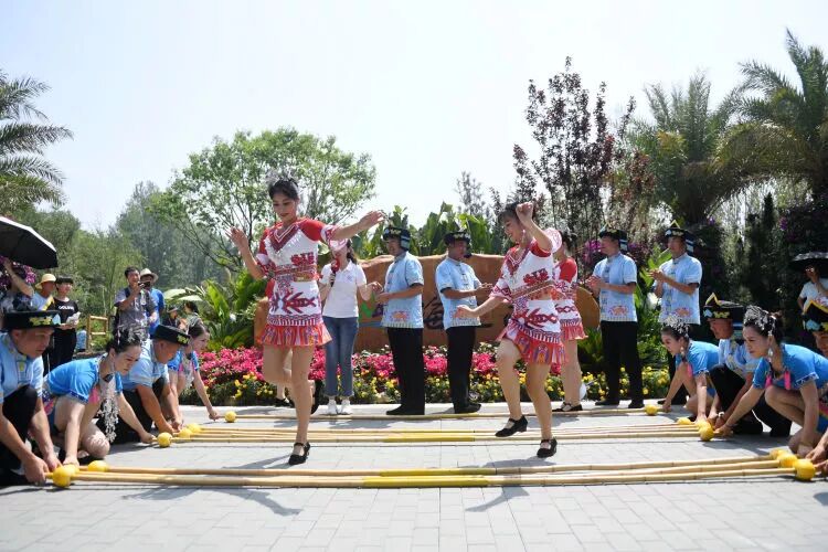 7月21日,演职人员在北京世园会海南园表演竹竿舞。新华社记者 张晨霖 摄
