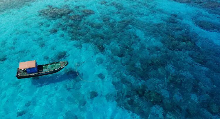 这是西沙永乐群岛的甘泉岛附近的海面(2017年4月23日无人机拍摄)。新华社记者 郭程 摄