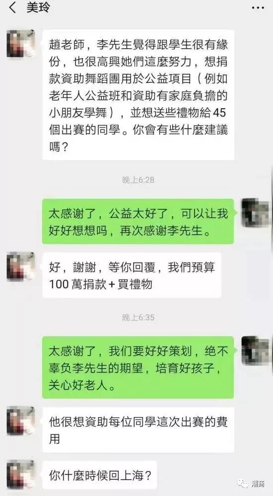 提示:点击上方"潮商"关注我们 近日,李嘉诚在机场偶遇一群参加跳舞比赛的中国孩子,事后资助100万旅费的新闻引起了网友们的热议。 李嘉诚的助理与带队老师的对话流出,助理表示,李先生觉得跟学生很有缘分,孩子们蓬勃向上的精神给他很大的触动,他决定想送些礼物给45个比赛的同学。没想到一出手就是100万。 ![]() 据悉,这群孩子来自上海市小白鸽舞蹈团,平均年龄10岁。近日舞蹈团的带队老师赵维接受媒体采访时,透露了更多的捐款细节。 首先老师澄清,网传的100万元并不准确,实际捐赠总额为200万元。 李嘉诚基金会和上海市小白鸽舞蹈团签署的捐助合同中表明,200万元分为两部分。其中的100万元,90万元用于45名舞蹈团成员参加在日本北海道“国际青少年舞蹈大会”相关差旅,10万元补助该舞蹈团因参加此次比赛的开支。另外100万元用于该舞蹈团一直在推行的老年人学习舞蹈的公益项目。 另外李先生答应捐款,不是什么相谈甚欢,而是因为孩子们的一个敬老爱老的小动作——当时舞蹈团和李嘉诚一行人同时走到北海道机场的一个滚梯上,因为看到李先生一行人中有一个耄耋老人,全体孩子都停下来主动把电梯让给老人先行,而老人看到让道的是一群小学生,有点过意不去,要求她们先上。于是,在日本的机场,发生了中国的老人和儿童互相礼让尊老爱幼的的暖心一幕。 ![]() 91岁的李嘉诚被孩子们尊敬老人的爱心打动了,当即跟助理拍板,孩子们这趟日本行的费用他全包了。 除了200万元之外,李嘉诚还给了45个孩子每人2万日元(折合人民币1300多元),用于在日本自行购买礼物。 那么孩子们用这笔钱买了什么呢?据舞蹈团的带队老师赵维透露,舞蹈团的成员和家长们都认为,孩子们从这件事上更要懂得感恩,“每人1300多元对于孩子而言也不是一个小数目,大家决定把这笔钱用来购买礼物,送给敬老院的老人们。” 资料来源:澎湃新闻、娱匠、梨视频等 声明:本文不代表我们的观点,仅供读者参考。文章版权归原作者所有,如有侵权,请联系我们进行删除。 潮 商 文化的境界 · 财富的智慧
