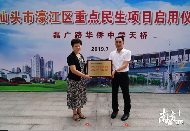 现场,濠江区为企业颁发牌匾。叶宾 摄 据达濠街道赤港社区居委会党总支部书记、居委会主任陈煜涛介绍,辖区内华侨中学学生人数较多,上放学时间,该路口经常出现车辆拥堵、行人横穿马路现象,安全隐患极大,甚至多发事故。人行天桥的建成,有效缓解了交通压力,对社区居民来说是一项惠民工程,实实在在解决群众问题。