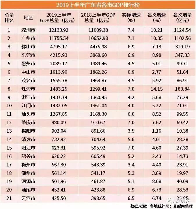 提示:点击上方"潮商"关注我们 近日 广东省各地市陆续公布经济半年报 深圳、广州继续领跑广东 ![]() 图片来源:南方+ 广东GDP排名前五的“大佬”依次是: 深圳:12133.92亿元 广州:11755.54亿元 佛山:4795.17亿元 东莞:4215.93亿元 惠州:2089.17亿元 ![]() 从图表上看,2019年,深圳上半年地区生产总值(GDP)达到12133.92亿元,增长7.4%,总量和增速均位居全省第一。广州的表现也不甘示弱,上半年GDP达到11755.54亿元,增长7.1%。广州、深圳经济总量约占全省47%。 ![]() 接下来,关注下前三名的经济情况 冠军:深圳 ![]() 深圳上半年GDP为12133.92亿元,按可比价格计算,比去年同期增长7.4%,居全省第一,高于北京(6.3%)、上海(5.9%)、广州(7.1%)三座一线城市。 值得关注的是,从推动经济增长的“三驾马车”来看,固定投资的增长最为显著,上半年全市增长17.6%,其中基础设施投资增长48.0%,房地产开发投资增长11.3%,工业技术改造投资增长12.1%。 国有经济增长34.5%,民间投资增长12.3%,外资投资增长65.5%。 据南方网报道,2019年深圳共安排重大项目471个,总投资18913.7亿元。今年1至6月,297个市重大建设项目累计完成投资952.2亿元,完成年度投资计划的51.4%。 从分产业看,上半年深圳第一产业增加值12.45亿元,增长5.1%;第二产业增加值4747.80亿元,增长7.3%;第三产业增加值7373.66亿元,增长7.5%。 数据显示,全市规模以上工业增加值增长7.4%。先进制造业和高技术制造业增加值分别增长10.3%和11.0%,占规上工业增加值比重分别为71.2%和66.7%。 从主要行业看,计算机、通信和其他电子设备制造业增长11.1%,电气机械和器材制造业增长4.8%,专用设备制造业增长6.5%,通用设备制造业增长2.7%,医药制造业增长11.4%,汽车制造业增长1.3%。 亚军:广州 ![]() 今年上半年广州全市地区生产总值11755.54亿元,增长7.1%,比去年同期提高0.9个百分点。 广州的固定投资也是增长提速,上半年固定资产投资3033.63亿元,增长24.8%。 从投资三大领域看,基础设施投资增长34.6%、房地产开发投资增长26.1%、工业投资增长22.7%。国有投资、民间投资的增速均超过40%,呈现出近年来罕见的高增长态势。 大项目引领作用显著,完成投资超十亿元的项目共62个,同比增加23个,完成投资占全市投资的比重为47.4%,同比提高8.2个百分点。 其次,广州经济总体发展稳中有进,新经济释放活力,八大新兴产业实现增加值同比增长6.7%,占全市地区生产总值的比重为17.7%。 其中智能装备与机器人产业增加值增长15.6%,轨道交通产业增加值增长8.1%。新型、智能化和高端电子信息产品成为新增长点。上半年,全市液晶显示屏产量约4555万片,增长8.1%;平板电脑、集成电路、电子元件产量增长均超过1倍等等。 另外,新业态新模式快速增长,例如跨境电商进出口增长50.4%,网购经济与网上点餐依然盛行,同比皆有所增长。 近年来,广州着力推动现代服务业出新出彩、先进制造业高质量发展,产业结构更加优化。数据显示,上半年广州产业结构调整持续推进,现代服务业仍是经济增长主要动力。 工业方面,上半年规上工业增加值增长3.7%。高技术制造业较快增长,增加值增长20.6%,占规上工业增加值的15.8%,同比提高3个百分点。 季军:佛山 ![]() 据羊城晚报报道,上半年,佛山全市完成GDP达4795.17亿元,增长6.9%,增幅分别高于全国、全省平均水平,也高于去年全年(6.3%),今年一季度6.7%的增速,充分体现了佛山市经济运行保持总体平稳、稳中有进的发展态势。 第一产业增加值70.82亿元,增长4.8%;第二产业增加值2757.55亿元,增长6.4%;第三产业增加值1966.80亿元,增长7.8%。三次产业结构调整为1.5:57.5:41.0。 规模以上工业增加值同比增加7.0%;大型工业企业增加值增长8.0%。 完成固定资产投资1852.52亿元,增长2.2%;全市重点项目完成投资536.54亿元,完成年度计划投资的62.71%,快于时间进度12.71个百分点。 佛山市市长朱伟表示,这是一个有含金量的增速,如上半年规模以上工业增加值2205.89亿元,同比增长7%,且工业经济效益持续改善,1至5月全市规模以上工业经济效益综合指数295.69%,同比提高15.8个百分点,规模和效益都体现了其含金量。 ![]() 最后,来看广东总体的情况报告 根据广东省统计局公布的数据显示,2019年上半年,广东省实现地区生产总值(GDP)突破5万亿元,达到50501.17亿元。 其中,第一产业增加值1689.42亿元,同比增长3.6%;第二产业增加值20521.99亿元,增长4.9%;第三产业增加值28289.76亿元,增长8.0%。 工业生产方面,总体缓中趋稳。 上半年,广东规模以上工业增加值同比增长4.8%,增幅与1-5月持平。从经济类型看,民营工业增长7.5%;从支柱行业看,计算机、通信和其他电子设备制造业增长8.9%、电气机械和器材制造业增长7.7%; 中高端的工业行业发展较快,上半年,先进制造业增加值同比增长5.8%,占规模以上工业的56.5%,比上年同期提高0.8个百分点; 高技术制造业增加值增长8.7%,占规模以上工业的31.6%,比上年同期提高1.5个百分点。 ![]() 值得一提的是,部分工业新产品产量增长较快,3D打印设备增长334.5%、新能源汽车增长184.2%、移动通信基站设备增长128.4%、液晶显示屏增长30.8%、智能电视增长11.5%。 进出口方面,增速回升。上半年,广东货物进出口总额32806.8亿元,同比增长1.3%,增幅比一季度提高2.3个百分点。 其中,出口19792.9亿元,增长3.9%;进口13013.9亿元,下降2.5%。贸易方式结构进一步优化,一般贸易进出口增长4.5%,占进出口总额的比重为50.2%,比上年同期提高1.5个