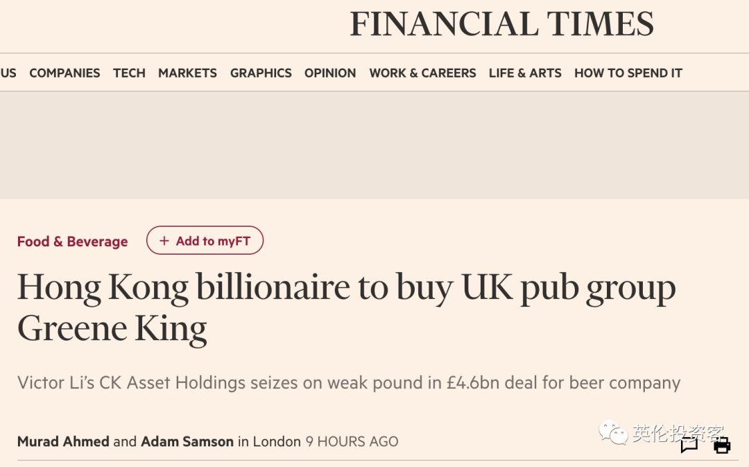 ▲图为Greene King历史股价表现 Greene King是富时250指数的成分股,交易完成后,Greene King将从伦敦交易所退市。 由于李嘉诚此次收购金额巨大,也引发了英国媒体的集体关注,纷纷在第一时间报道了这则重磅交易。 《金融时报》:香港亿万富豪买下英国酒吧集团