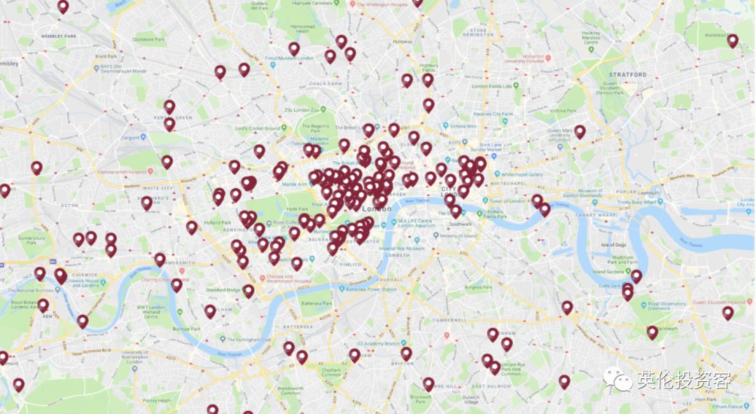 的确,英国大部分酒吧都位于每个城镇中心的黄金地段,占据着寸土寸金的位置,李嘉诚这次收购,看中的主要是酒吧的地产价值、以及其源源不断产生租金的能力。 再联系上边我们放过的这张图,大家应该就懂了,Greene King在伦敦持有的酒吧基本上都集中在一区。