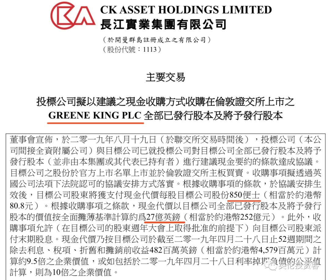 ▲图为被收购方英国Greene King发布在伦交所的公告 根据公告,长实将支付27亿英镑现金,并承担Greene King 19亿英镑的债务,两者相加得出的46亿英镑,就是英国百年酒吧集团Greene King的最新估值。
