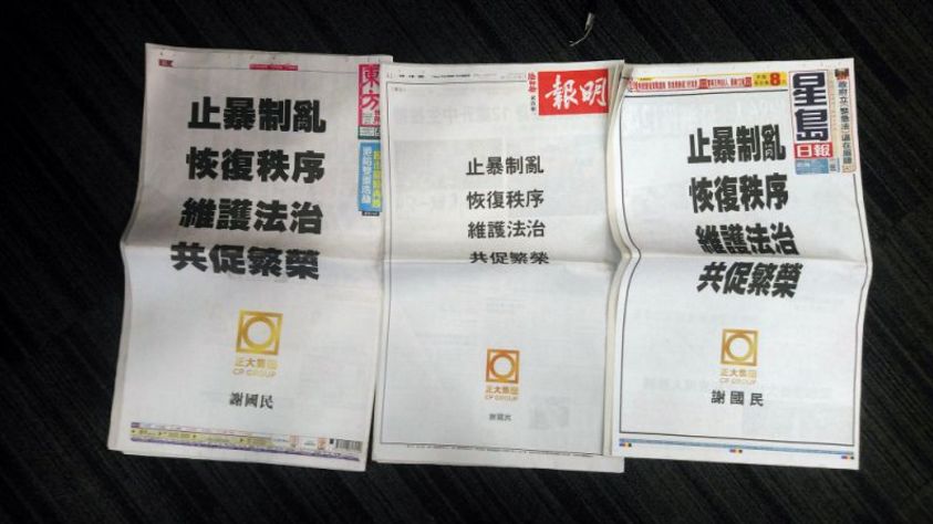 泰国头条新闻社讯 香港动乱已经持续数月。8月27日,现排名全球福布斯排行榜第75位、泰国福布斯首位的泰国正大集团资深董事长谢国民,在港媒《东方日报》《星岛日报》《明报》三家报社的头版刊登了四句口号,呼吁“止暴制乱、恢复秩序、维护法治、共促繁荣”,结尾印上了正大集团的标志和落款 谢国民。