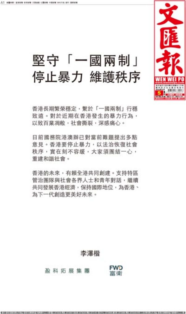 香港特首林郑月娥提出以四项行动化解僵局后,长和系资深顾问、李嘉诚次子李泽楷,今日(5日)以“盈科拓展集团”及旗下“富卫保险”的名义,在《大公报》《文汇报》《东方日报》等多份香港报纸刊登广告,他呼吁香港要停止暴力,以法治恢复社会秩序,并支持特区管治团队与社会各界人士和青年对话。