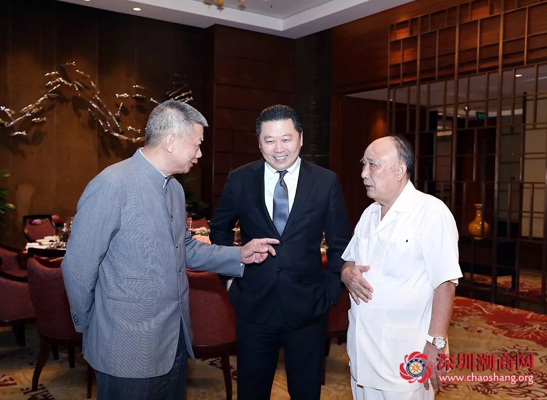 深圳市潮汕商会创会会长吴开松(右)、名誉会长郑桂泉(左)与正大集团董事长谢吉人(中)交流
